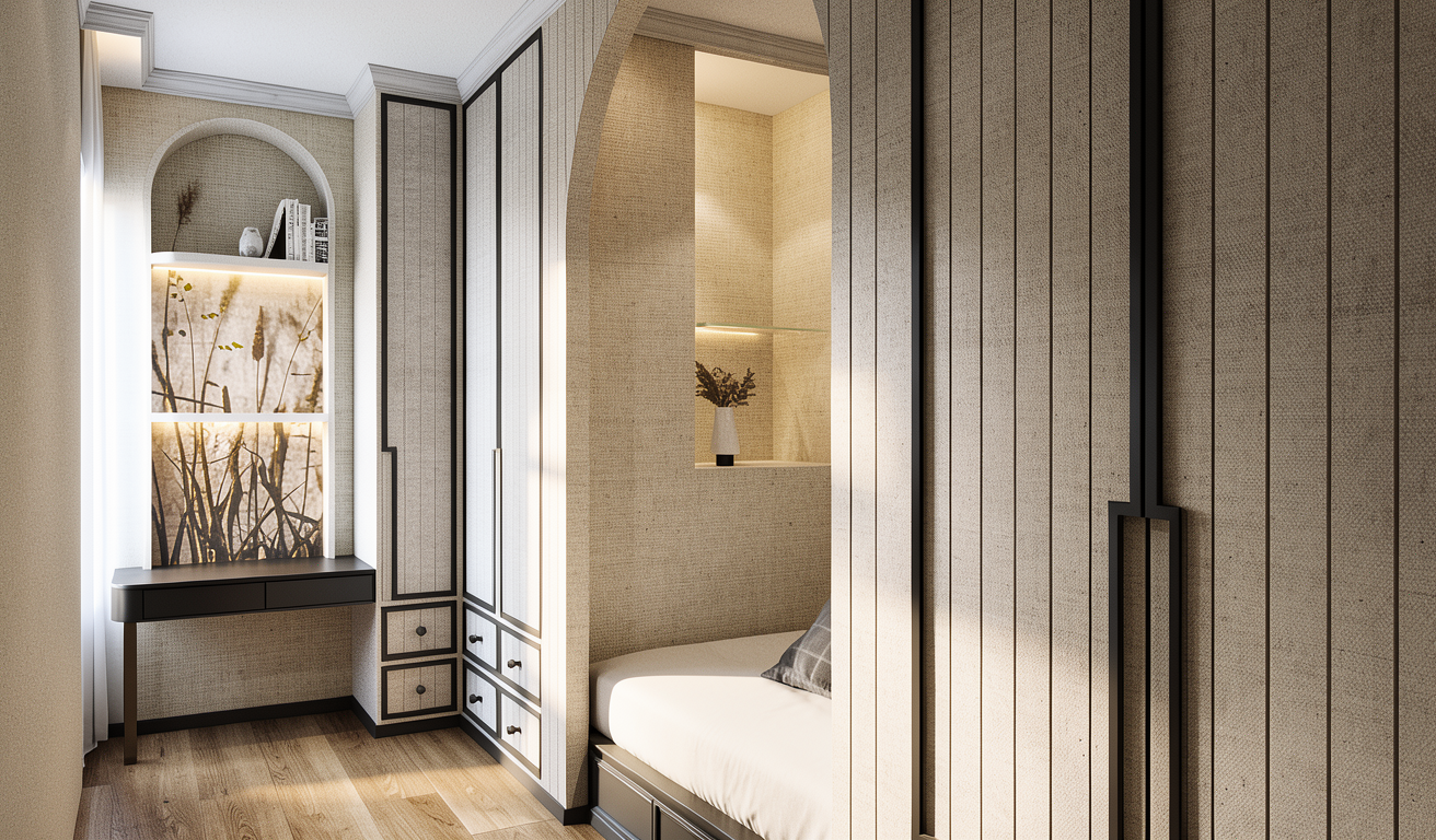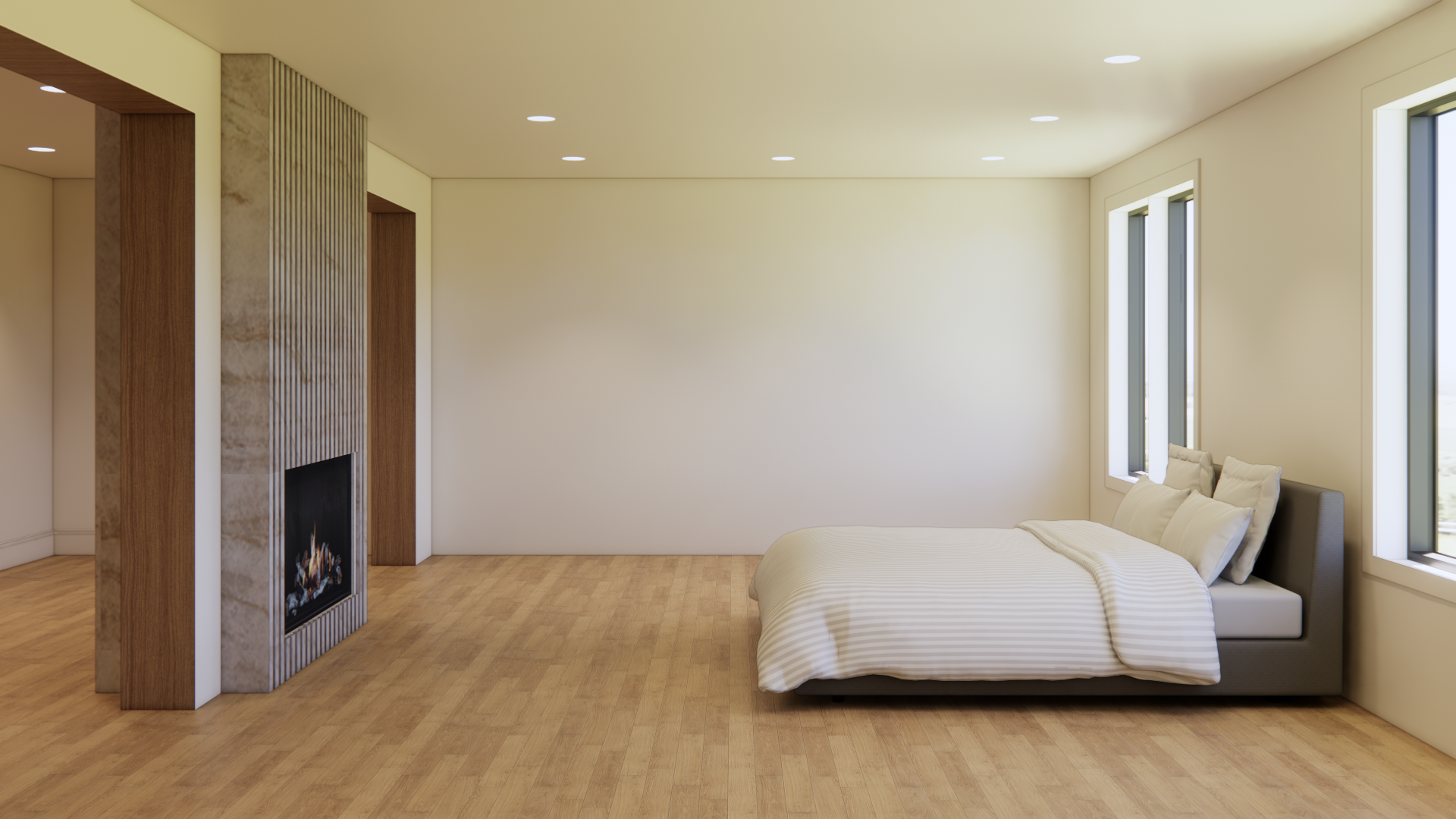 preserve the architecture layout lighting and camera angle of the original rendering exactly do not modify walls windows ceilings cabinetry flooring or built in elements replace placeholder furniture with pieces inspired by restoration hardware and minotti design language design style quiet luxury interior combining restoration hardware scale and warmth with minotti s sculptural modern silhouettes the space should feel calm architectural and curated furniture characteristics low profile furniture with substantial proportions sculptural forms soft rounded edges and thick upholstered volumes materials boucl upholstery performance linen suede honed marble travertine wire brushed oak warm walnut and brushed bronze or brass accents color palette warm neutral tones including ivory cream sand taupe soft greige and natural wood tones furniture arrangement balanced and architectural composition with generous spacing pieces should feel substantial and grounded lighting soft natural daylight combined with warm indirect lighting 3000k subtle shadows and natural light falloff rendering quality ultra photorealistic architectural photography style 35mm lens balanced exposure realistic textures subtle imperfections and natural reflections the final image should resemble a luxury interior photographed for architectural digest or a high end real estate marketing campaign