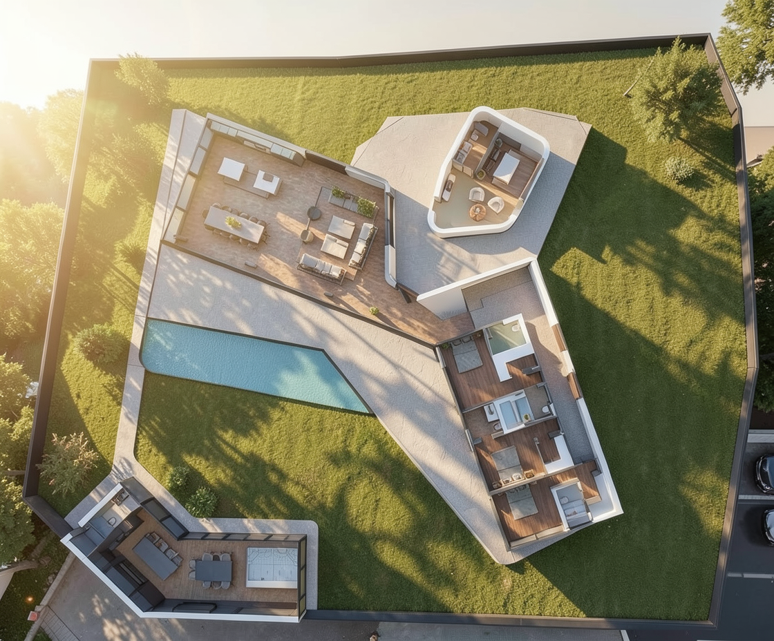 r aliste rajouter des personnes assises en terrasse sur la terrasse en bois