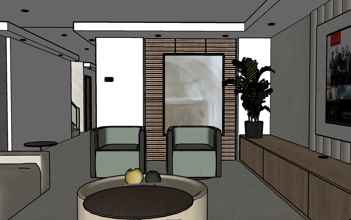 interior from the top slate beige flooring with a light oak panelled wall and a modern painting hanging in front light oak tv unit with a large pot plant sitting on top green fabric arm chairs is the main feature of the room a modern dark walnut and light beige set coffee table sits in front of the arm chairs behind the tv is a carrara marble veined wall panel and behind the wall panel is a beige fabric headboard in a smooth finish architecture