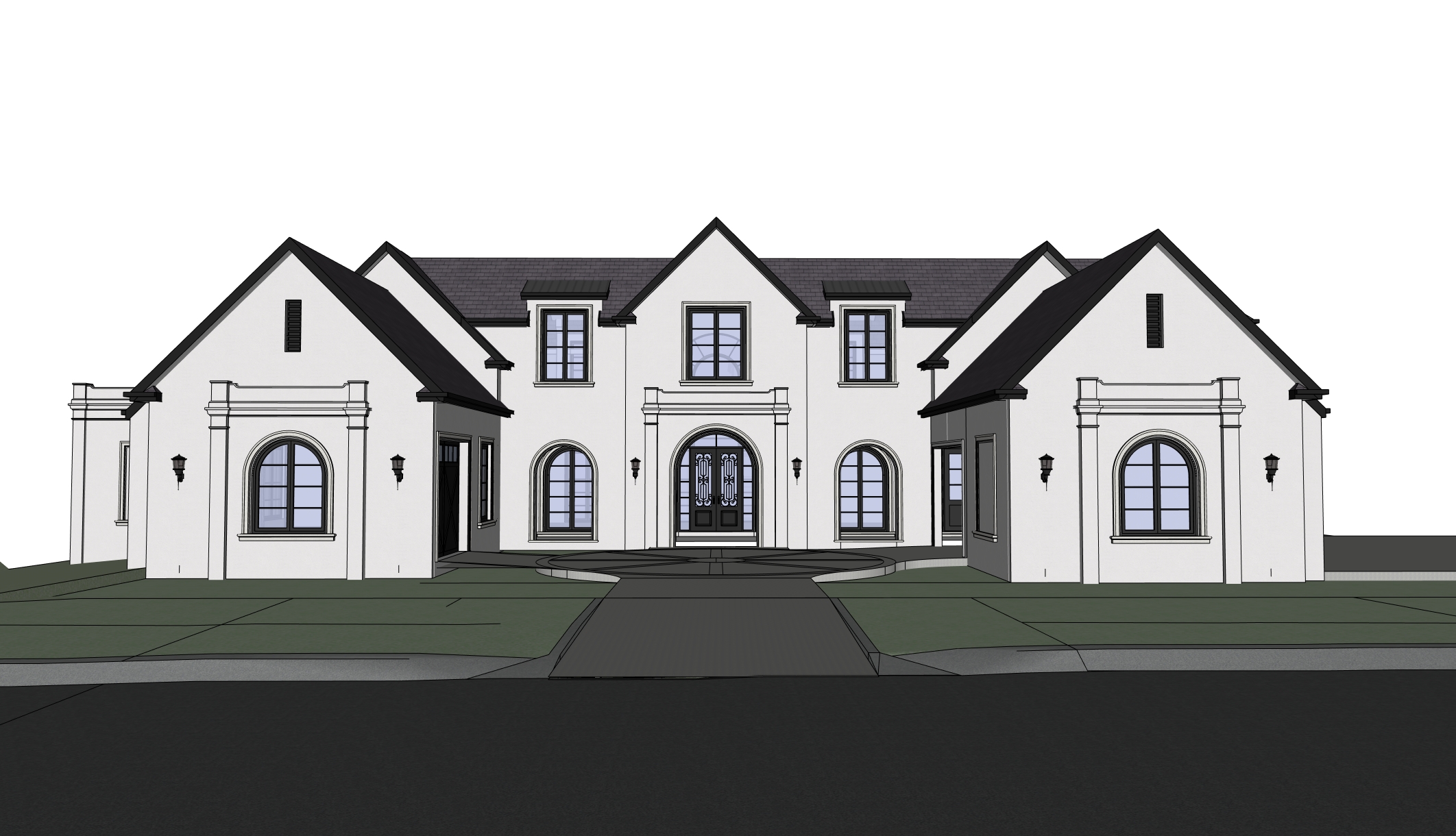 a high end architectural visualization of a symmetrical french country style residence viewed from a frontal approach through a curved driveway the composition emphasizes balance elegance and a formal landscaped setting style classic french provincial architecture with a refined minimalist interpretation photorealistic rendering with soft diffused natural lighting and a calm slightly desaturated tone for a sophisticated aesthetic colour palette main exterior warm off white light beige rendered stucco roof soft dark grey slate with minimal tone variation window frames matte black doors wrought iron entry door with glass insert metal elements matte black lanterns hardware landscaping rich greens with structured hedges and soft planting paving light neutral stone and exposed aggregate aggregate material scheme exterior walls smooth rendered stucco plaster with a matte finish roof natural slate tiles with fine texture and minimal variation windows metal frames with clear glazing entry door wrought iron entry door with glass insert and satin finish driveway exposed aggregate with stone edging bitumen road pathways cut stone or limestone pavers with subtle joints landscape manicured hedges topiary forms and soft lawn lighting environment soft daylight morning or late afternoon with gentle shadows slightly overcast or diffused sky for even lighting warm ambient bounce light to enhance material richness rendering details ultra realistic pbr materials with subtle imperfections high resolution 4k output eye level perspective centered on the main entry axis balanced contrast slightly muted highlights for a timeless feel