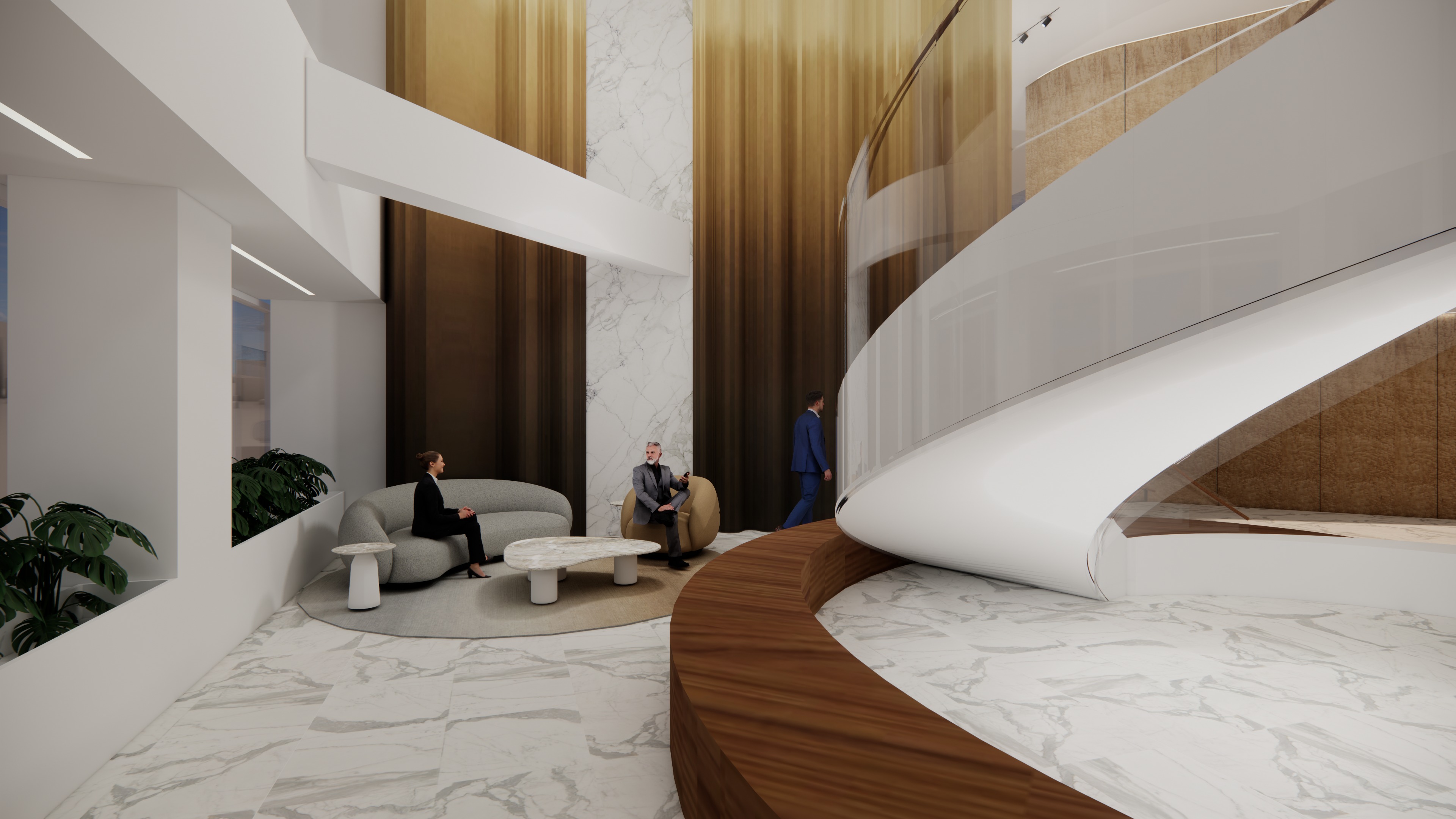 transform the provided interior image into a high end photorealistic render with soft glowing highlights and relaxed upscale energy while keeping everything exactly the same same proportions same seating same ceiling same wall finishes same materials and same spatial configuration do not move or alter any objects geometry textures colors or furniture positions all objects throughout must remain exactly in the same locations and proportions on the left windows only provide nyc building views from 44th floor in the middle of midtown new york city in the noon light do not change people