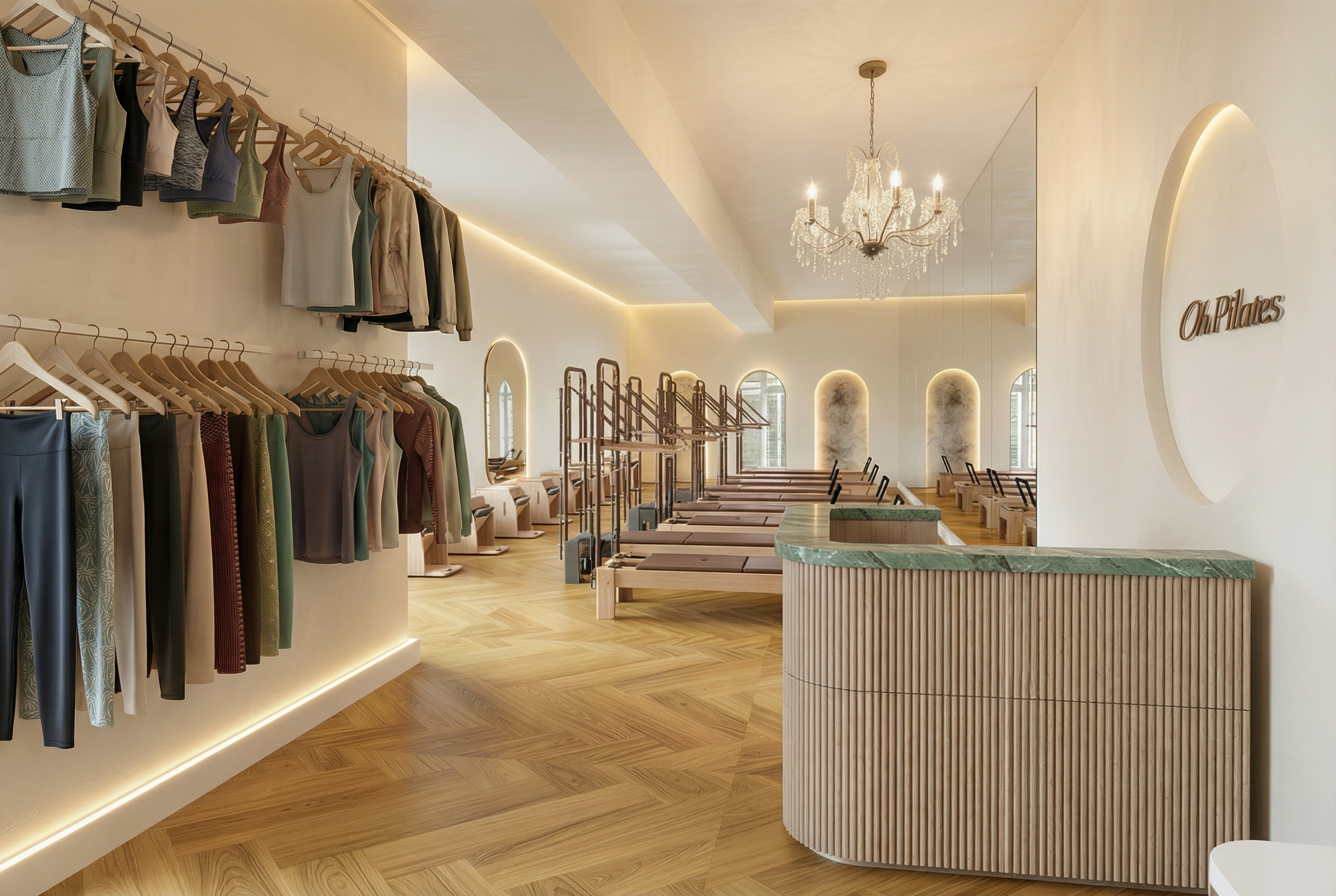 change the clothing on the racks to athletic clothes the ribbed wood looks unproportional should be smaller ribs and in a white oak finish the herringbone flooring should be warmer tone keep the image exactly how it is the wall behind the short pilates chairs on the left should be floor to ceiling mirror