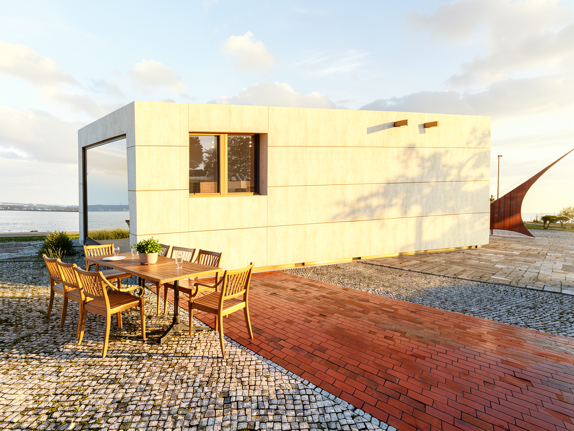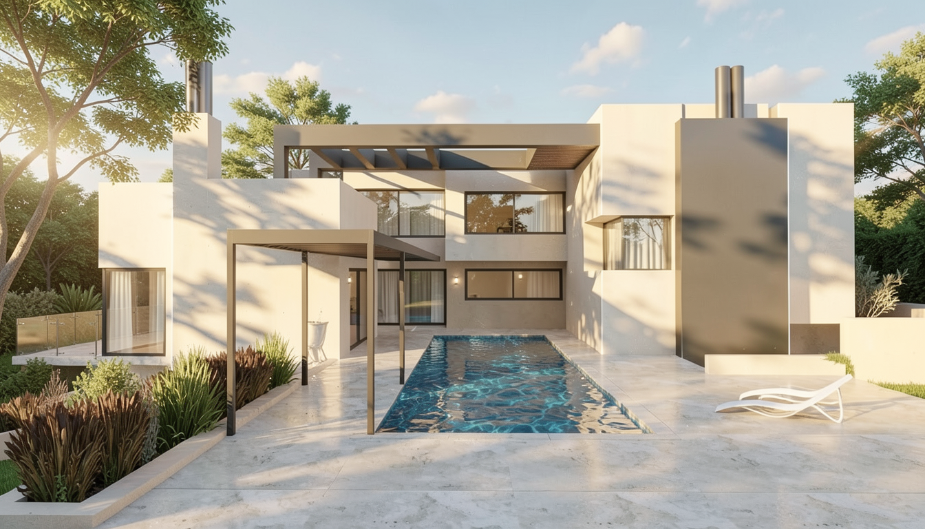 photorealistic high end kitchen interior frontal view warm minimal luxury style natural materials calm atmosphere soft indirect lighting editorial architectural photography a bespoke kitchen made of light oak wood with a subtle vertical grain seamless integrated handles no visible hardware lower cabinets along the back wall feature softly rounded end panels on the left and right side a continuous light grey travertine countertop with a matching full height travertine backsplash featuring soft horizontal layering and natural texture like reference image in front of the back wall a sculptural kitchen island in the same light grey travertine with rounded corners the island includes an integrated sink and a minimal brass quooker tap behind the island partially visible a classic la cornue range cooker with brass details above it a brass extractor hood as a subtle focal point on the right side of the room full height light oak cabinets extending to the ceiling in the center an open niche with a warm brass interior finish below the niche a floating drawer unit approx 30 cm above floor with a travertine top perfect proportions highly refined detailing no clutter no decoration soft indirect lighting soft ambient light no harsh shadows materials are tactile and realistic matte oak wood layered grey travertine stone brushed brass accents shot in editorial photography style slightly soft shadows natural color grading ultra realistic high resolution 35mm lens