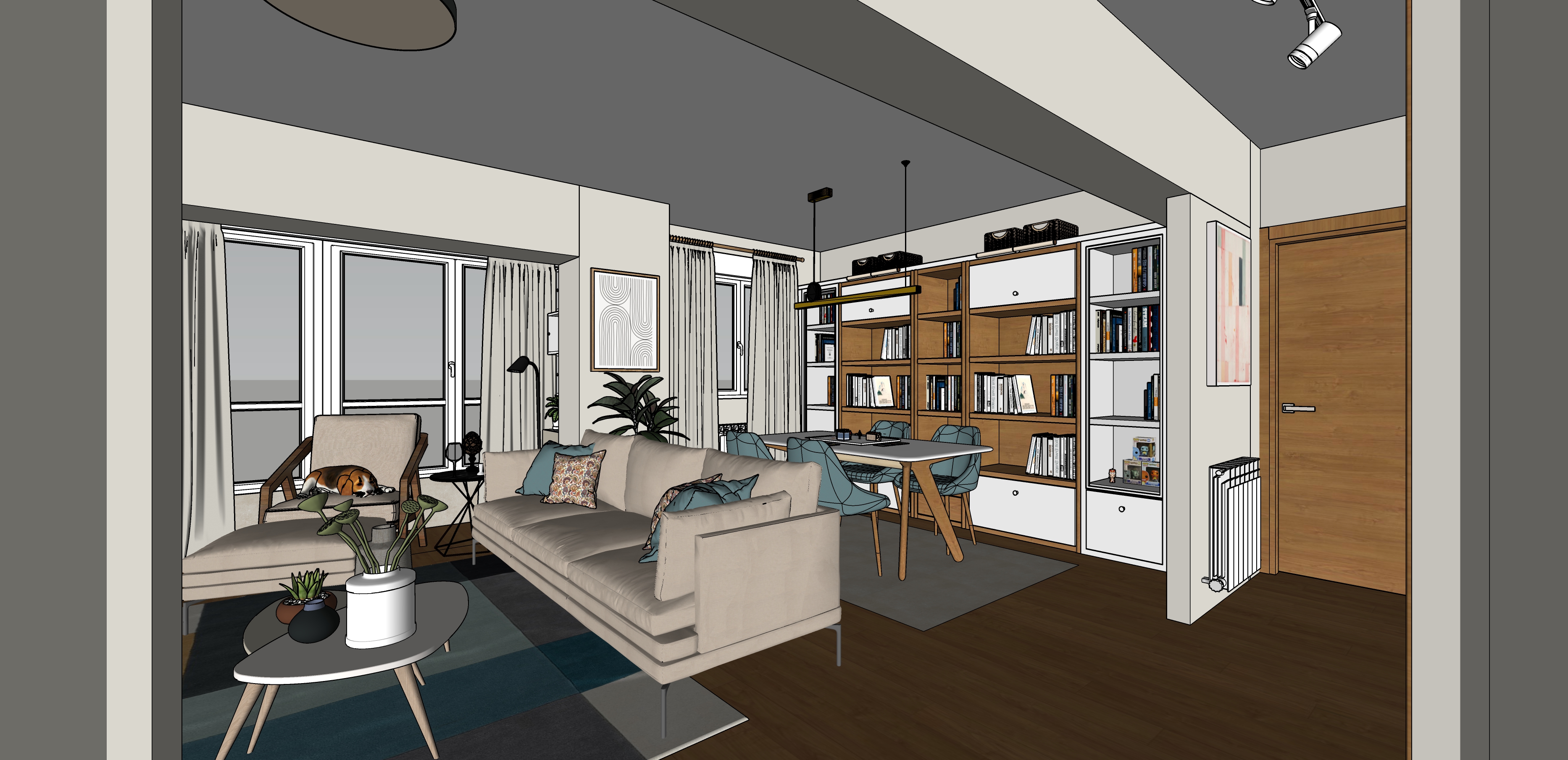 exterior shot gorgeous modern living room with a blend of pastel and earthy tones the walls are painted in soft beige with large windows that allow natural light to flood the room the furniture includes a beige leather sofa adorned with pastel blue and patterned cushions accompanied by a cozy beige armchair the coffee table is white with chic small decorative items including plants the bookshelf is wooden with white accents and filled with books and decorative elements the dining area features a sleek white table surrounded by pastel blue chairs the atmosphere is bright airy and welcoming the hardwood floors in a warm oak tone add to the cozy ambiance architecture