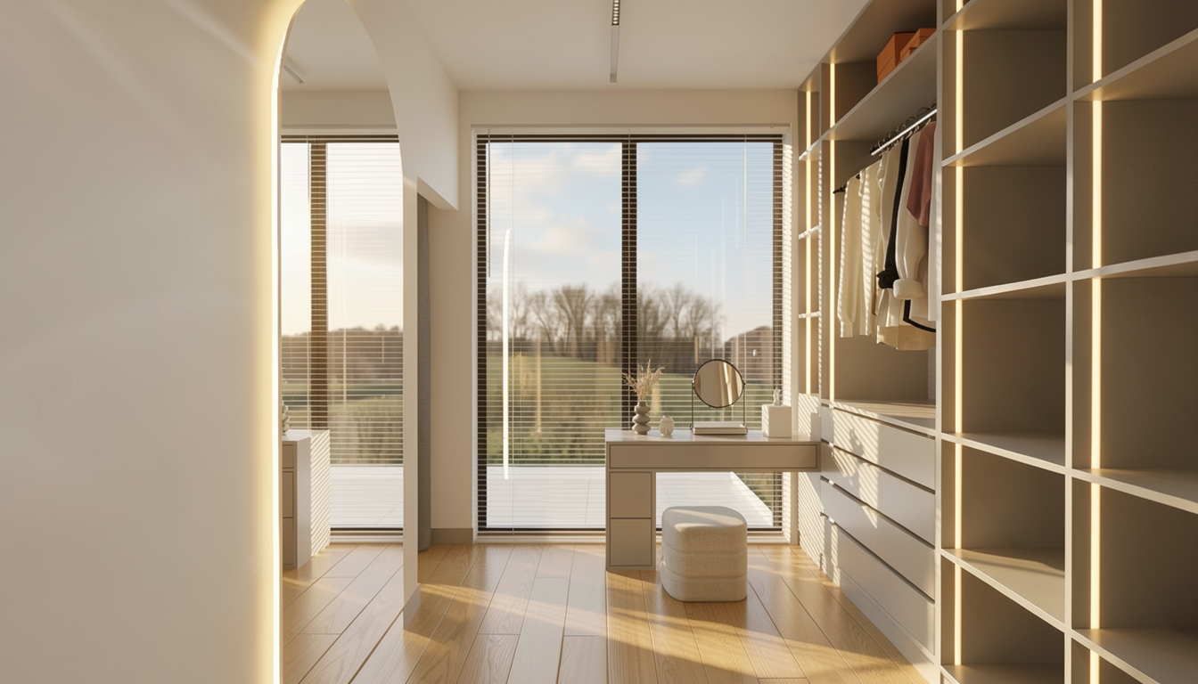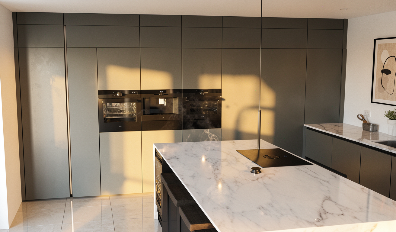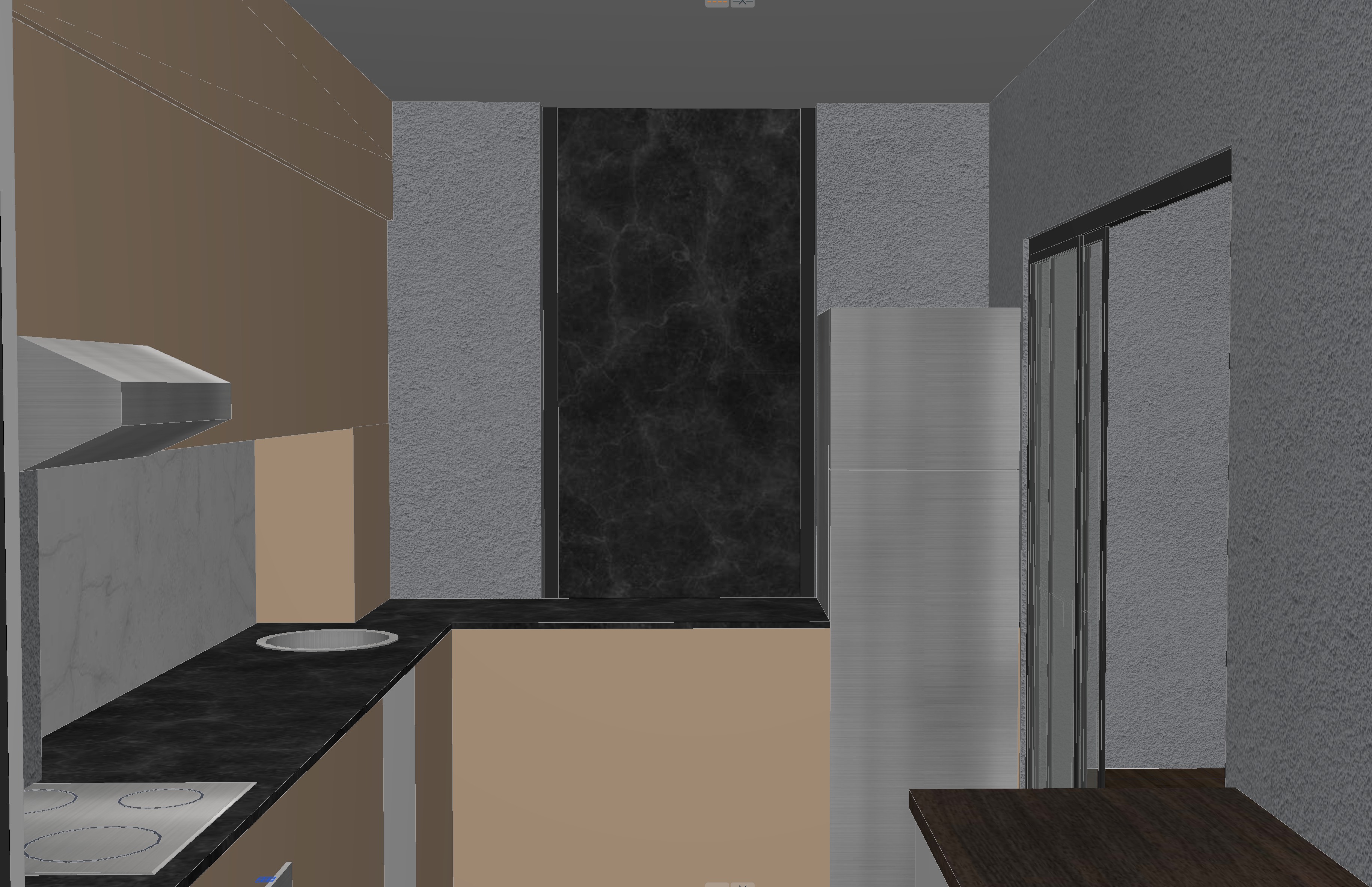 modern compact kitchen interior narrow layout frontal perspective at the back wall a large illuminated onyx panel acting as a feature wall glowing softly with natural vein patterns in dark tones kitchen furniture with mdf doors in warm wood finish oak or walnut tone flat panel handleless design for a minimalist look countertop made of black marble with subtle white veining polished surface left side continuous countertop with integrated cooktop and sink upper cabinets aligned horizontally right side tall unit with integrated stainless steel refrigerator walls finished in light grey textured plaster neutral and matte floor in dark wood or dark ceramic tiles for contrast lighting soft ambient lighting plus under cabinet led strips highlighting the countertop and enhancing the glow of the onyx wall style modern minimalist slightly luxurious high contrast between warm wood and dark stone
