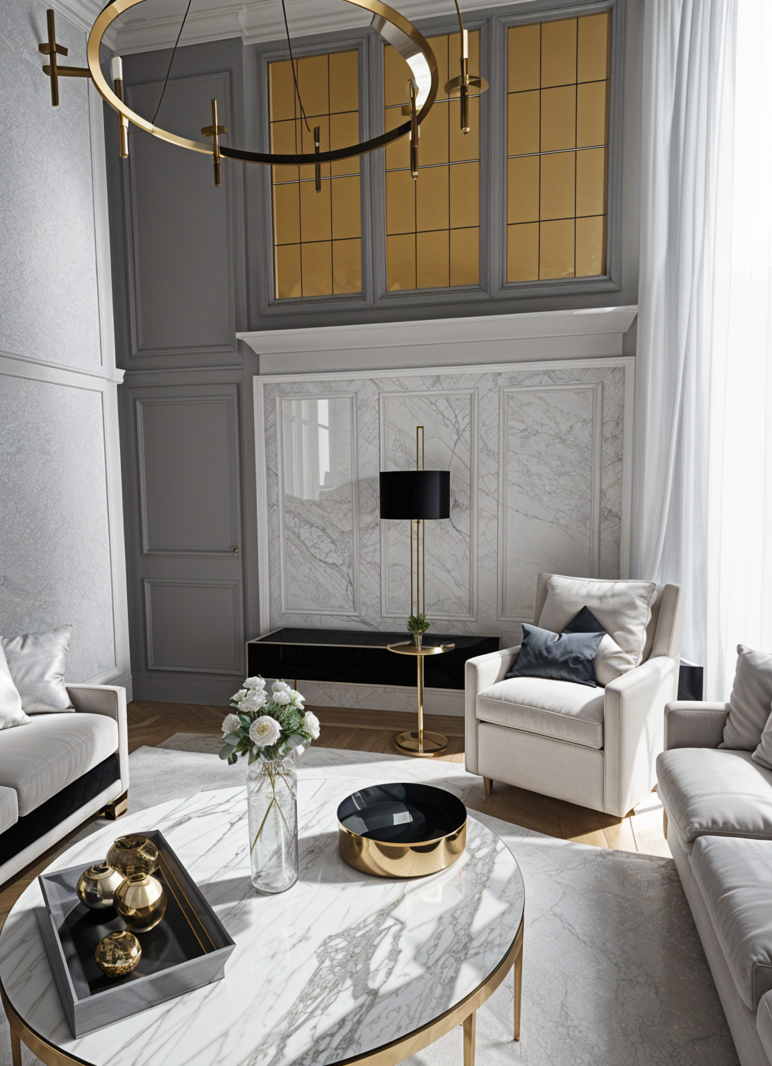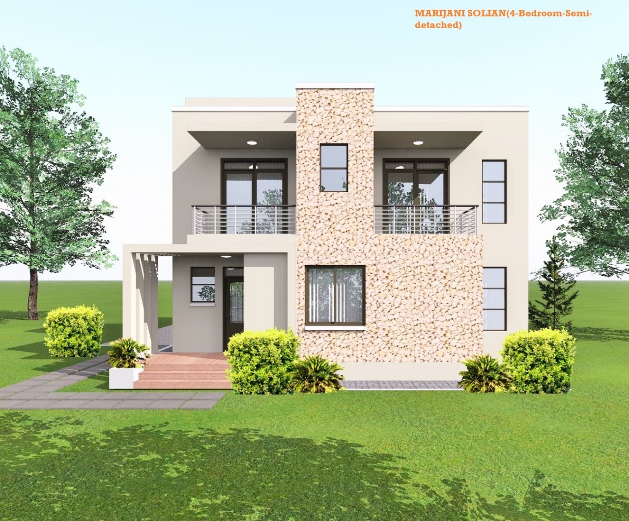 a modern two story house with a sleek design featuring large glass windows the walls are a soft beige color creating a warm inviting appearance the stone wall is textured with light cream and subtle beige tones metal railings are a polished silver adding a contemporary touch the lush green garden at the front is vibrant with perfectly manicured bushes and grass trees reflected in the windows enhance the natural feel the sky is a bright clear blue contributing to a serene and refreshing atmosphere