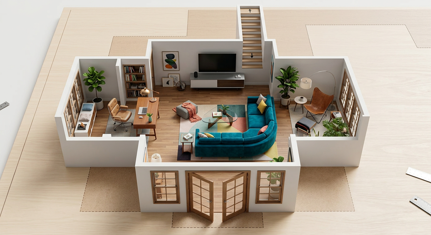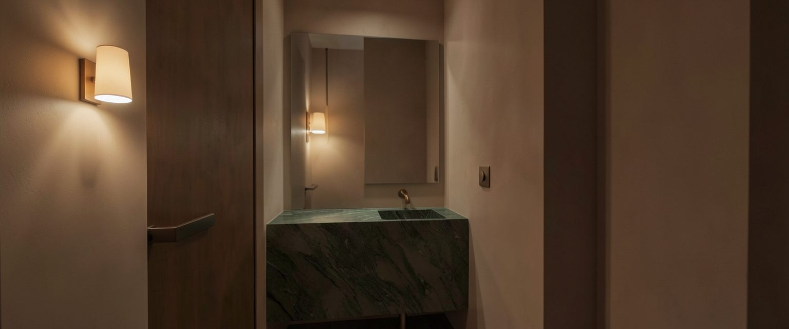 negative prompt read first priority override do not generate any extra sconces strictly forbidden any ceiling lights or recessed lighting any pendant lights any mirror integrated lighting any accent walls or mixed wall materials any tile except what is explicitly allowed any bright showroom lighting any evenly lit catalog bathroom lighting any default bathroom layouts any symmetrical double sconce setup any white sterile cgi lighting if any of the above appears the render is incorrect scene build rule force from scratch build a custom architectural powder room from a blank scene do not use any default bathroom template or lighting setup material lock hard constraint all walls 100 of surfaces portola paint brooks in roman clay finish uniform across entire room warm creamy white plaster tone soft hand applied variation matte slightly imperfect light absorbing surface floor grato picos in exquisite wood planks warm natural wood matte pbr finish slightly darkened due to low light no gloss no shine vanity basstone nyc green oasis marble deep green organic stone honed matte finish sculptural slab heavy presence mirror 24 w x 54 h frameless slab mirror only no frame no border no bevel clean edge reflective glass faucet elemento ceiling mounted bronze faucet brushed bronze soft patina physically based metal reflections control one wall mounted bronze knob only minimal cylindrical form functional subtle no extras lighting system most important section there is only one light source in the entire scene ida wall lamp by st phane parmentier located only on left wall this is the sole illumination in the space lighting behavior warm tungsten 3000k 3200k low intensity cinematic dimness strong falloff into shadows corners must fall into darkness naturally no fill light of any kind no ambient smoothing no evenly lit surfaces anywhere lighting should feel like a nighttime architectural photograph the space must clearly read as single light source architecture camera composition 35mm lens eye level architectural photography subtle depth of field editorial framing architectural digest moody issue style composition should allow negative space and shadow depth render style v ray corona physically based rendering accurate global illumination ray traced reflections realistic roughness maps visible shadow gradients natural exposure falloff no overprocessing or hdr brightness exposure underexposed 1 to 1 5 ev look white balance warm interior tungsten intent summary for ai priority a moody single light source european powder room photographed at night where the only illumination is one sculptural wall lamp the rest of the space is intentionally shadowed calm and atmospheric