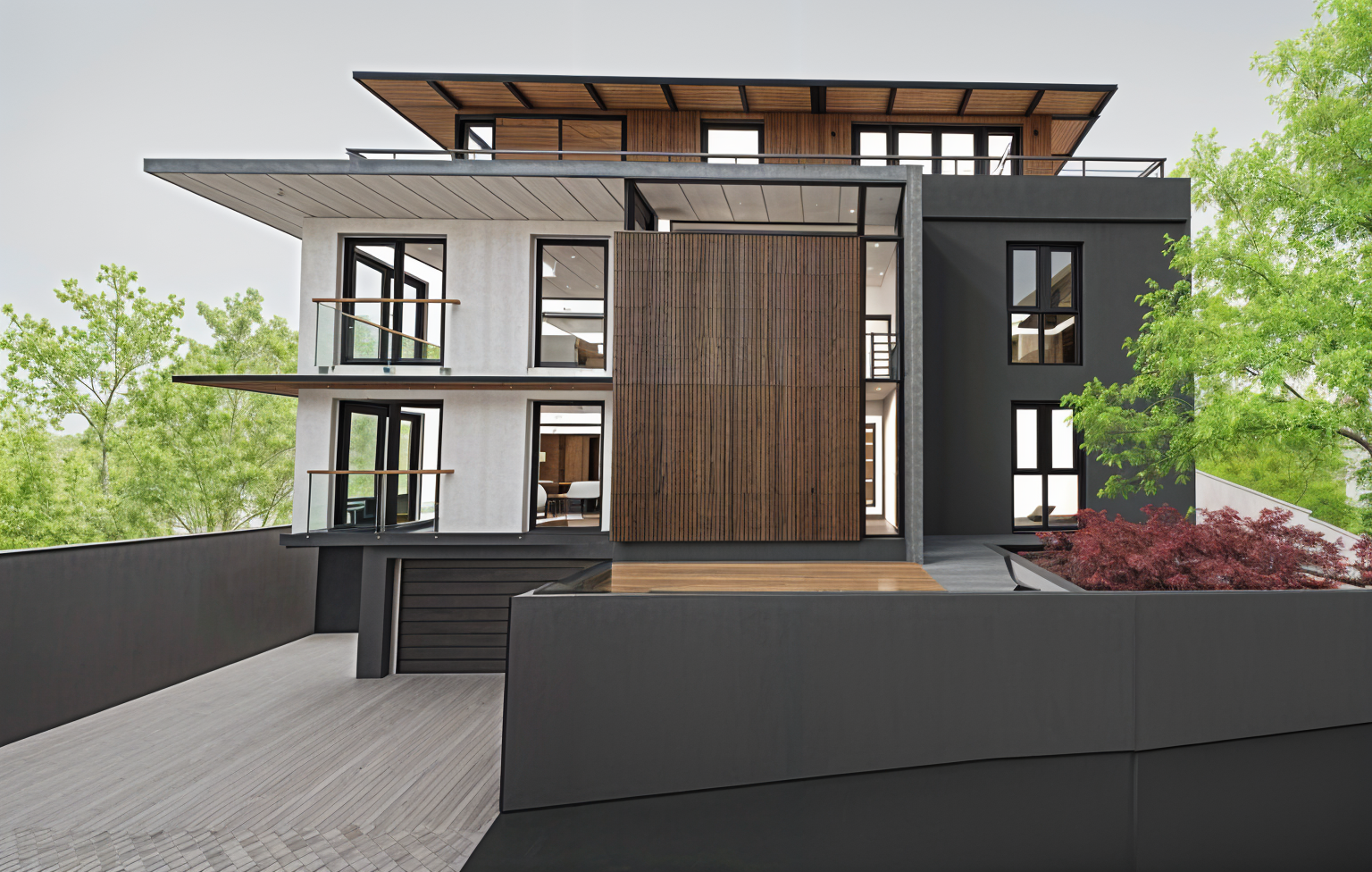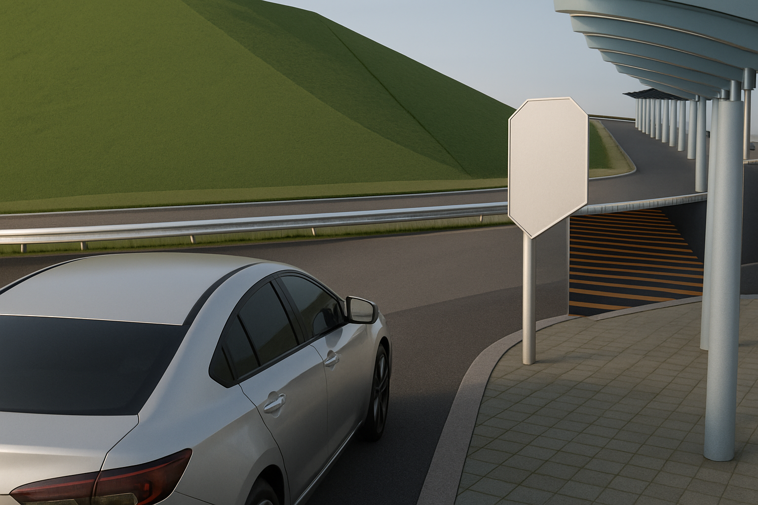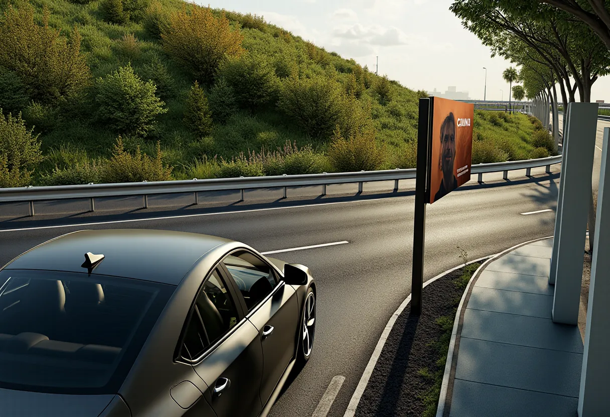 convert this signage design graphic into a realistic 3d external pylon signage and stage it within an outdoor environment show it in a dynamic perspective view positioned by the roadside with a partial view of a car on the road beside the signage for scale the signage panel is made of aluminum with a hairline rose gold finish featuring subtle bends and curves as indicated by the shading in the design reference surround the signage with trees shrubs and realistic roadside landscaping for environmental depth signage dimensions 1170 mm wide 3610 mm tall render in archsynth architectural realism natural daylight cinematic depth accurate reflections photorealistic materials and cohesive lighting integration with the outdoor environment the building material is acm panel not reflective