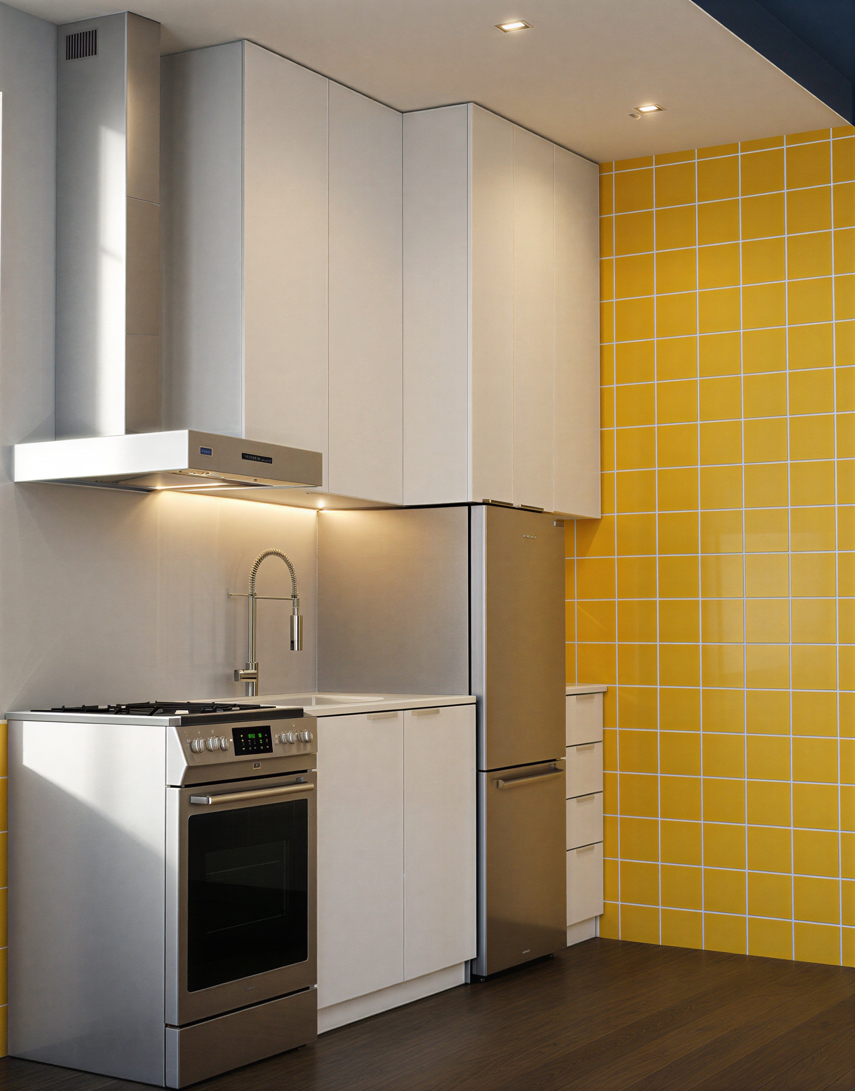 keep the kitchen exactly as it is maintaining the same layout cabinets lighting appliances and the yellow tile wall on the right only replace the backsplash area between the countertop and the upper cabinets including behind the stove and under the hood with white tiles of a similar size and grid pattern to the yellow tiles on the right wall