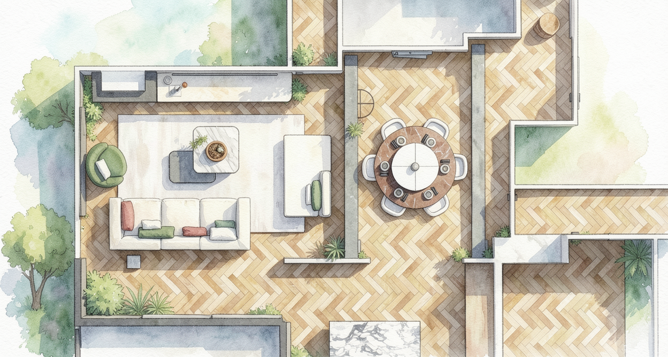 necesito que me crees un plano ilustrado como si fuese una acuarela en base a esta imagen de sketchup quitame la vegetacion dale menos luz