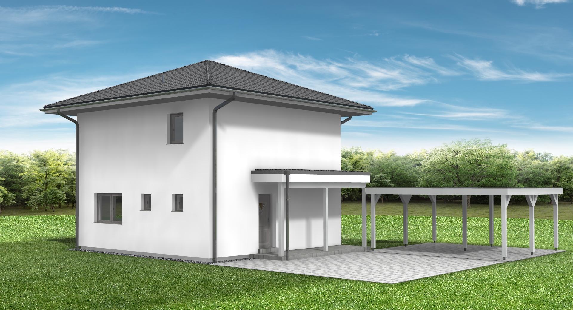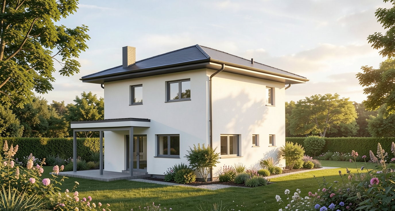 erstelle f r dieses bild eine realistische au enansicht dach anthrazit fassade wei fenster und haust re hellgrau das haus soll in einem dezent modernen garten situiert sein behalte alle ma e und farben des hauses exakt bei