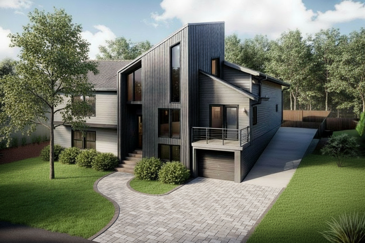 where is red i want perforated bricks in copper colour where is yellow i want fluted panels in natural oak colour where is green i want a cappuccino colour balconies are white near a park city lights in the back rails are black window frames are dark grey turn on the streetlights and the lights from the cars perforated brick walls are lighted from behind led stripe at the upper level all arround in the front put some alleys with new vegetation in front change the green from the facade with cappucino