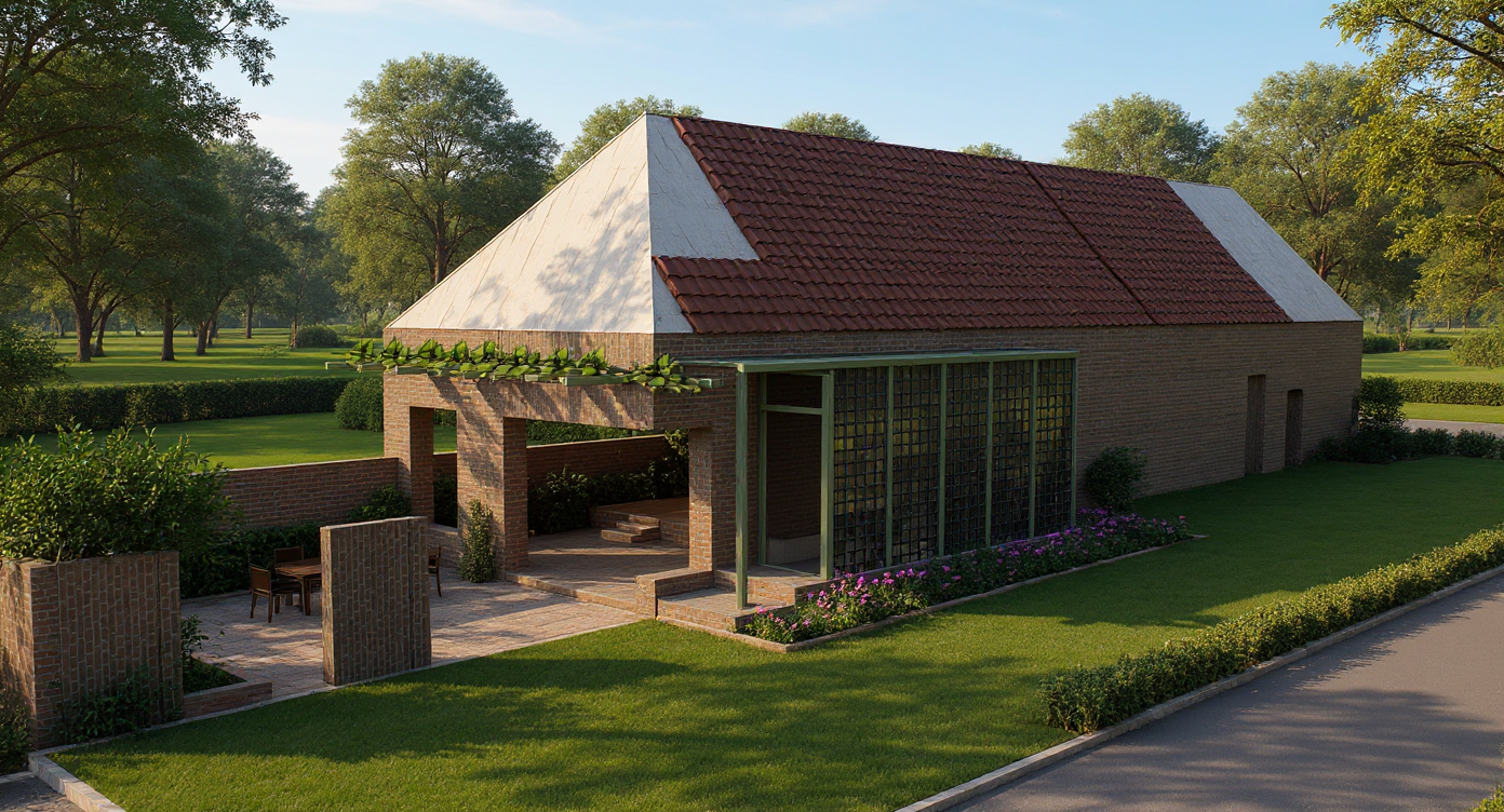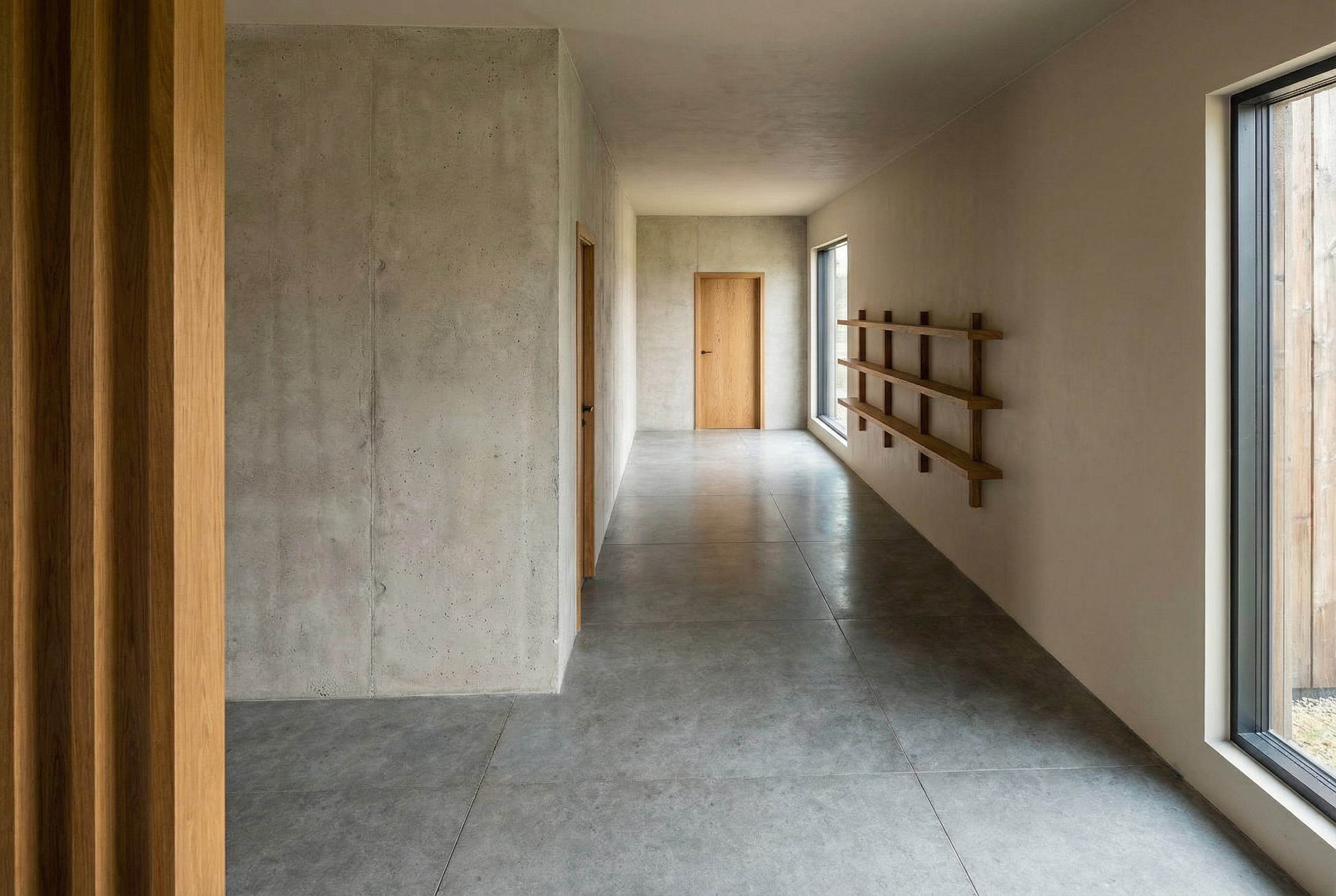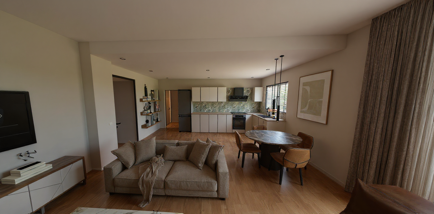 using the attached exterior rendering as the design reference generate a realistic interior photograph that matches the architecture style materials and overall character suggested by the exterior reflect the same aesthetic through interior choices such as window shapes ceiling heights layout flow lighting and finishes create a cohesive interior space that feels naturally connected to the exterior architecture maintaining consistency in style materials tones and design details render the interior as a high quality photorealistic image
