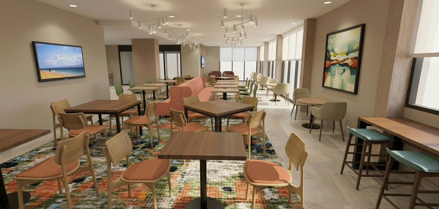 maintain all colors materials textures and building elements add some people sitting in the chairs