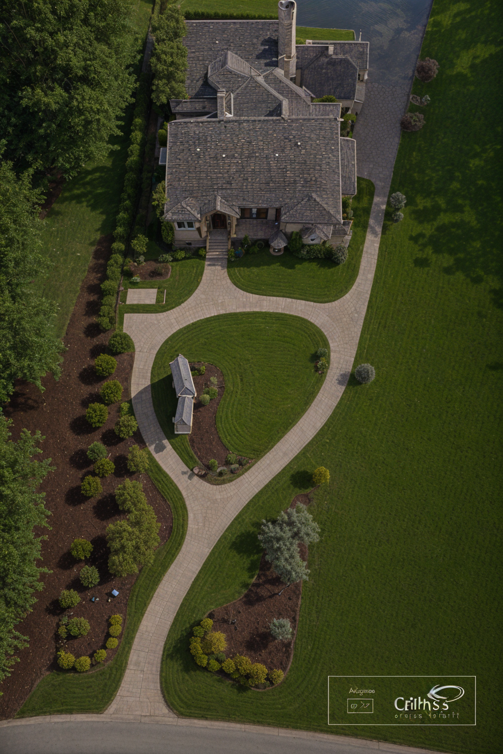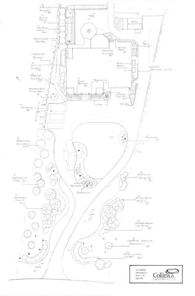 add color to this landscape plan keep in 2d view plant beds with mulch asphalt driveway paver walkway paver rear patio