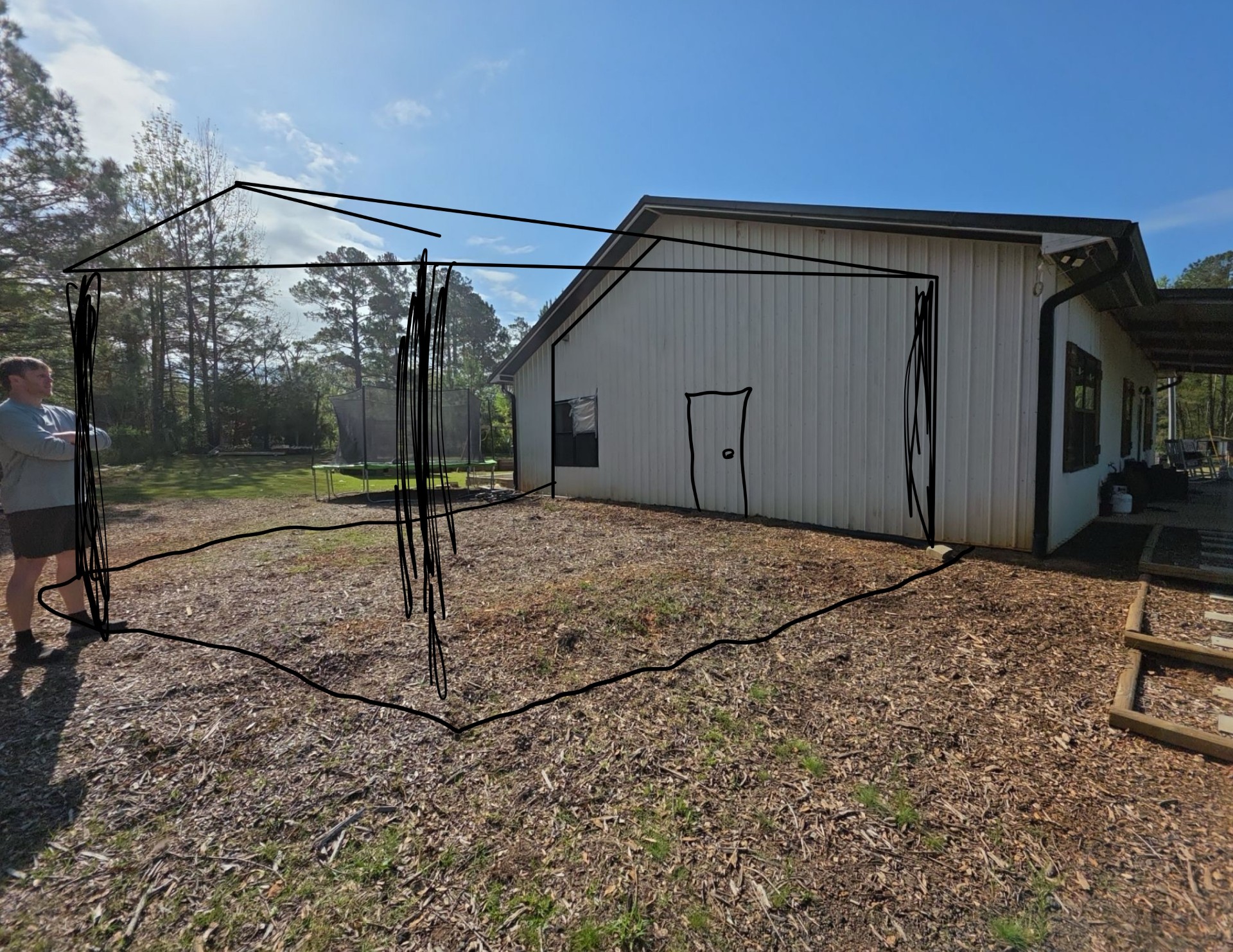 render a carport with lumber 6x6 posts and a concrete pad connected to the house remove the window on the side of the house but add the door the roof is black ribbed metal