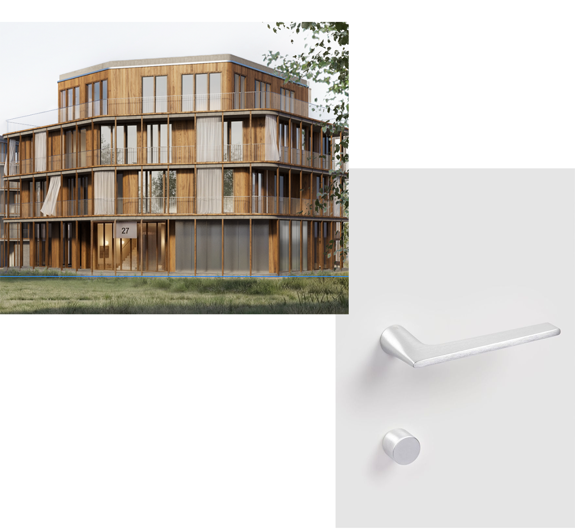 exterior shot strictly preserve the original image edit only the doors in the image their material and added door handles everything else remains completely untouched do not change walls floor ceiling elevator staircase lighting colors reflections materials or any other elements everything except the doors must remain completely untouched change the door material to match the facade reference warm medium oak slightly golden tone soft natural saturation subtle vertical grain matte finish avoid reddish tones avoid dark walnut tones avoid grey desaturation add a minimal modern door handle brushed stainless steel matte finish slim lever handle with a simple round lock below keep original lighting shadows reflections and realism no global changes no style transfer only local edit of the doors