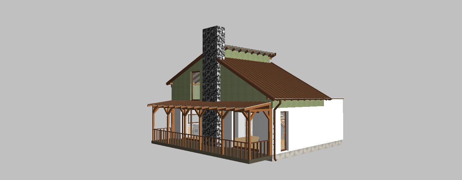 render a cozy countryside house with a warm inviting atmosphere the roof should be a rich earthy brown complementing the wooden porch and railings in a natural oak color the walls are a soft olive green vertical wooden facade on 2nd floorand white standard wall facade on first floor while the chimney is textured with rustic stone in shades of grey and black the front porch suggests a welcoming space surrounded by lush greenery and flowers in bloom the lighting is soft and golden evoking a peaceful sunset ambiance with a clear sky above shadows gently highlight the architectural features creating depth and warmth the roof is made of chocolate brown trapezoidal metal sheets with matching chocolate brown metal gutters window sills are also in the same chocolate brown color pvc windows and doors are chocolate brown with a matte finish the terrace fence is made of brown wooden boards