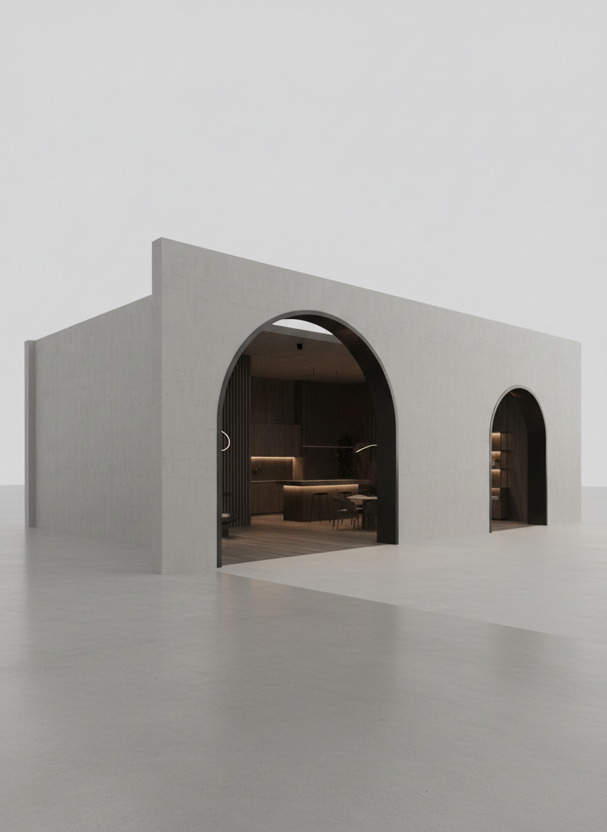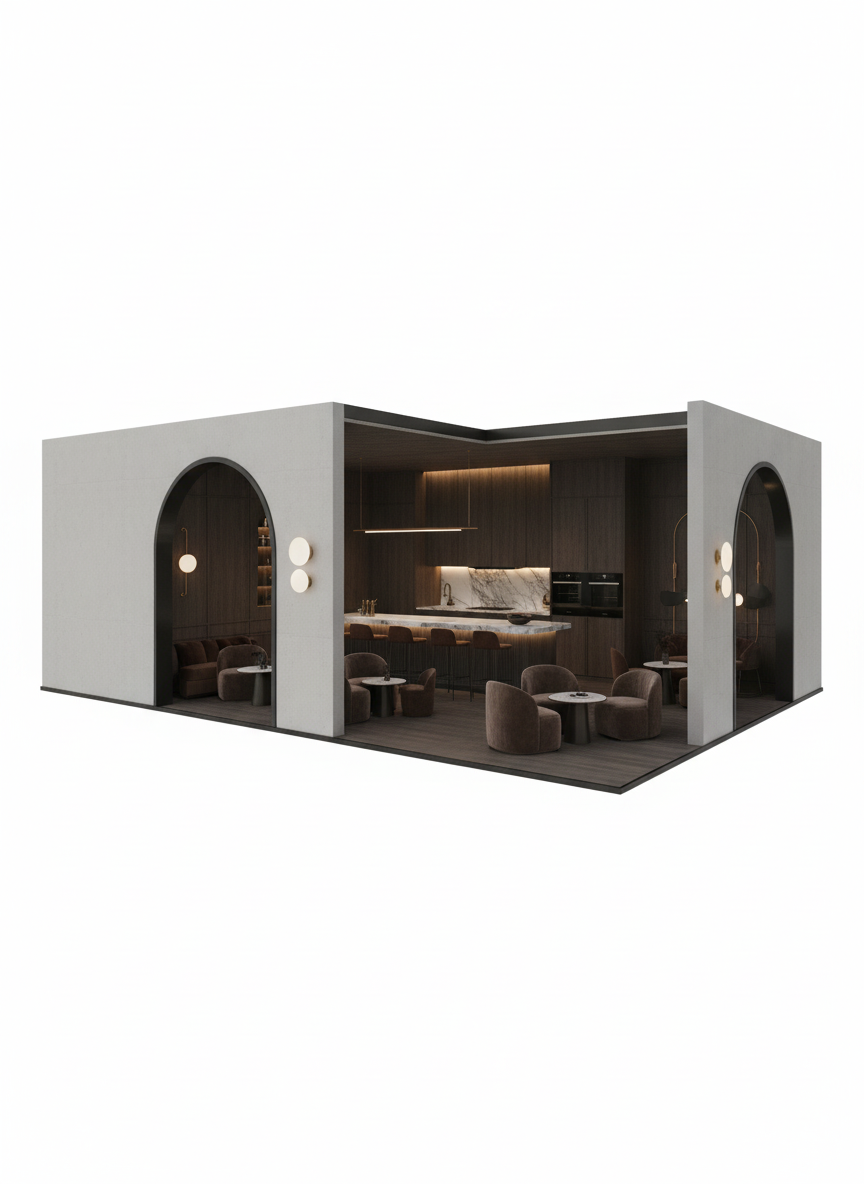 seen from above architectural exhibition booth design 20 feet x30 feet footprint conceptual spatial study focused on circulation and human movement clear entry zone leading into a calm interior sequence balance of openness and enclosure intentional pauses and framed moments architectural promenade rather than open plan emphasis on flow proportion and spatial rhythm human scale reference neutral monochrome palette abstract architectural volumes no signage no branding no decorative elements no furniture focus no product display soft diffuse lighting architectural model aesthetic