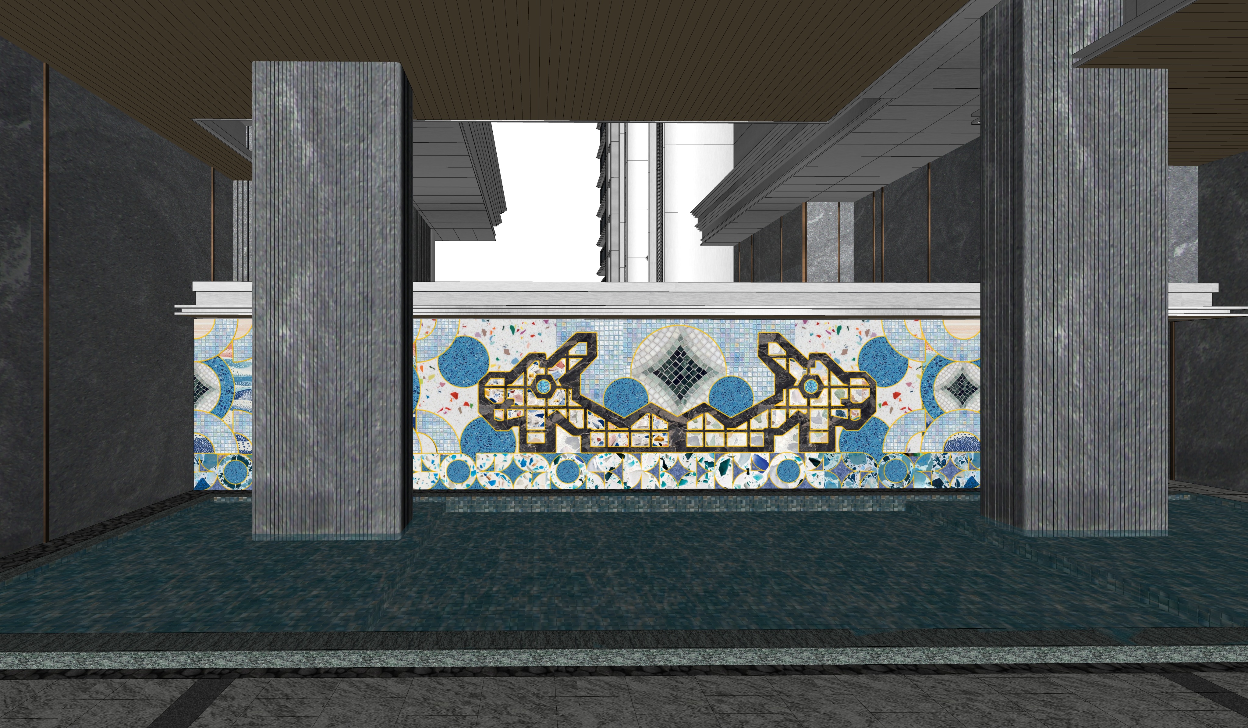 modernist exterior shot please keep my original drawing angle camera position composition and proportions exactly the same do not change the perspective or redesign any part of the artwork only enhance the lighting and render quality to make it more realistic please also make the mural wall art more vibrant and colorful while fully preserving the original design intent pattern language and overall visual concept architecture
