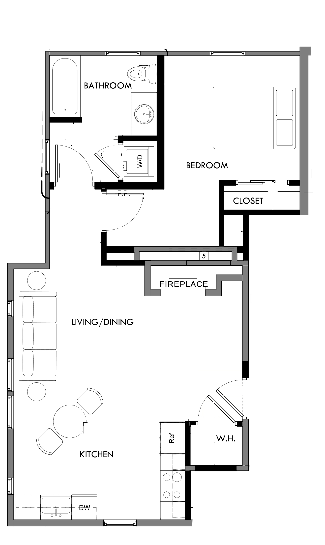 convert this floor plan into a realistic isometric 3d view of a full house show the space from an elevated angle with furniture walls and details visible neutral colors gray wood floor throughout traditional but basic show fireplace use the same furniture as shows on the plan do not change the orientation of the floorplan