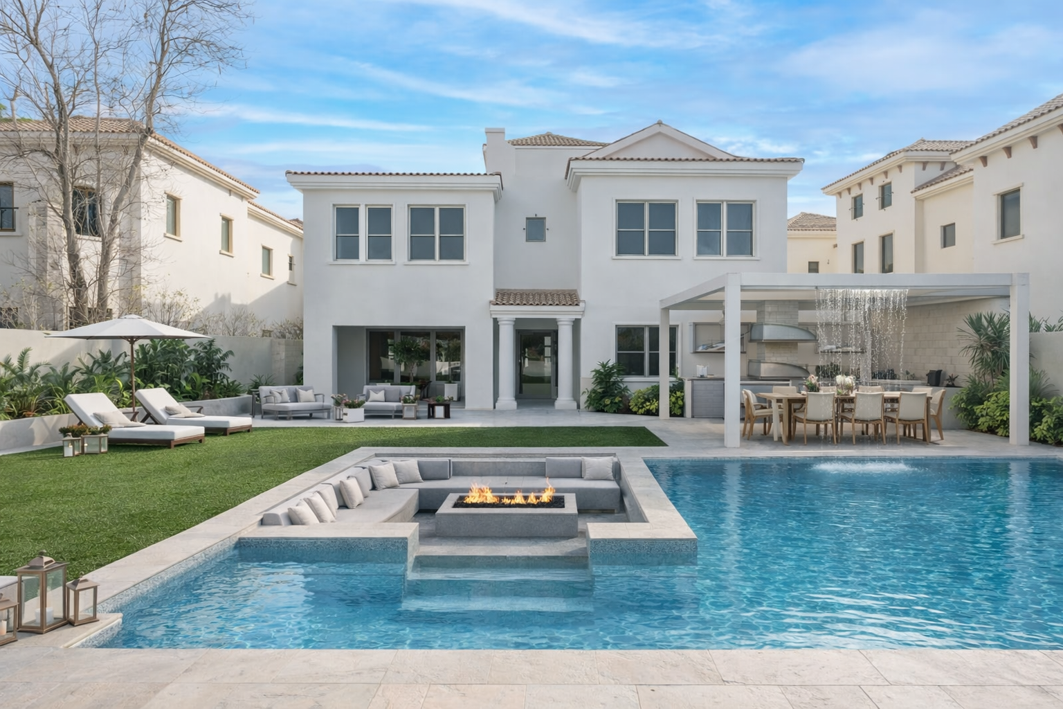 create new camera angles of this exact architectural project this is an already designed and finalized project you must preserve everything exactly as shown in the original image do not modify architecture pool shape and dimensions sun shelf spa furniture layout materials landscaping trees and plant species pergola structure outdoor kitchen lighting conditions background houses sky terrain property boundaries do not redesign reinterpret modernize enhance or optimize anything the only change allowed is camera position generate alternative realistic viewpoints of the same exact space as if a professional architectural photographer moved to different positions around the project new angles should include slightly elevated perspective eye level perspective from the opposite side diagonal corner perspective view from inside the pergola looking outward subtle aerial angle not too high maintain same lighting same shadows same time of day same materials same proportions same scale accuracy the result must feel like the same project photographed from different positions not a variation not a redesign photorealistic precise architecturally accurate