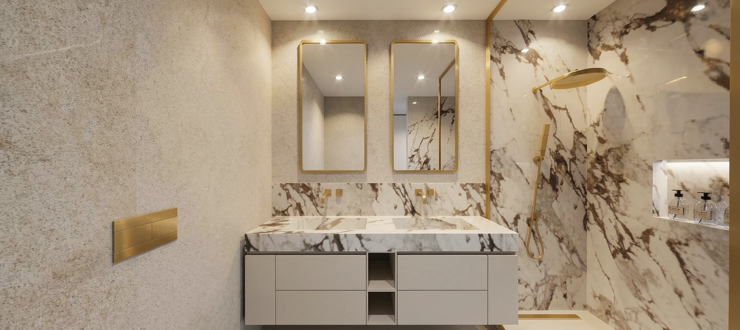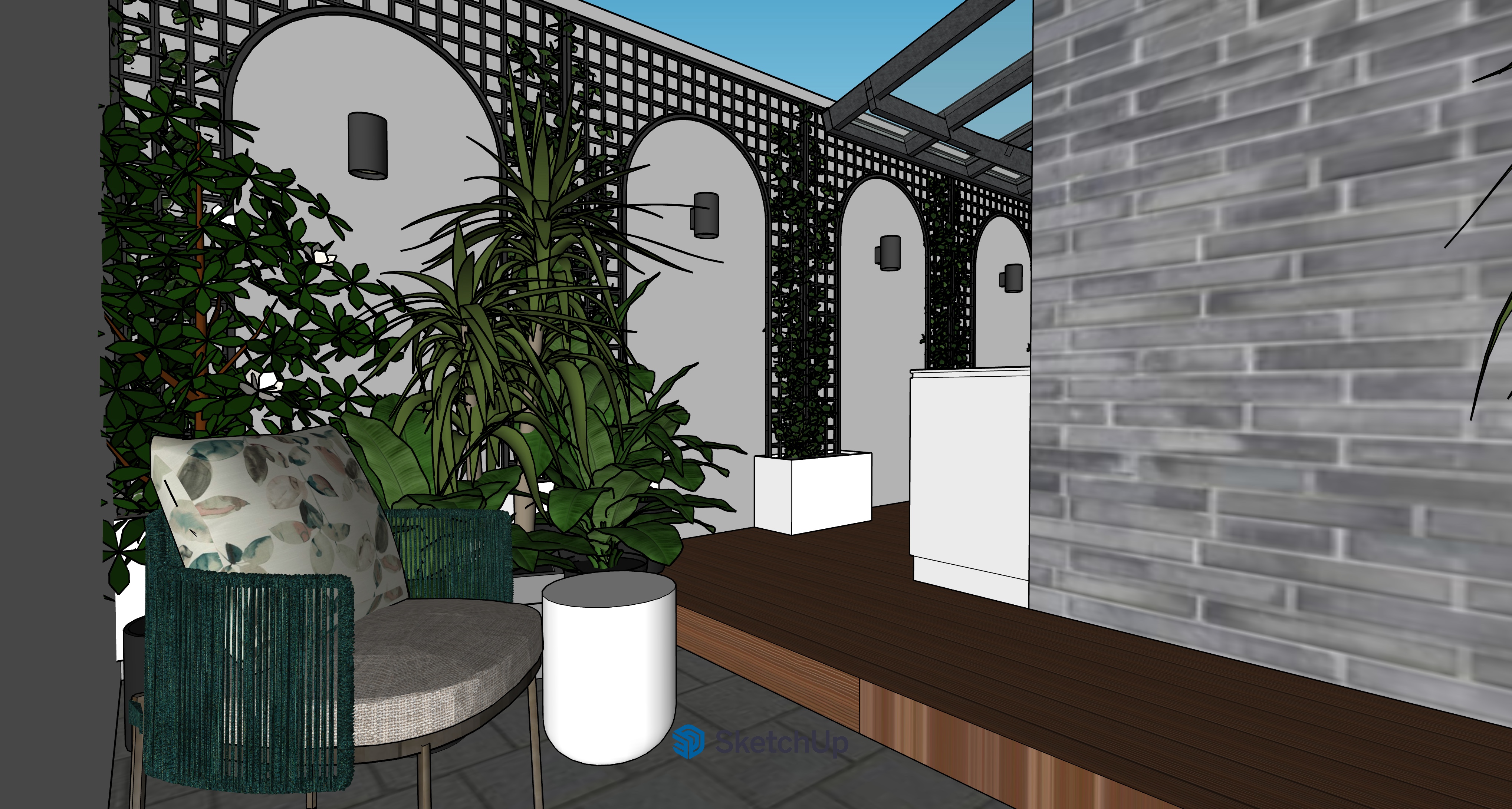 photo realistic render of a modern outdoor corridor at twilight with a sleek and elegant atmosphere the walls on the left are a gray venetian plaster a accented by black victorian arches fretwork with green ivy the floor is rich dark brown wood adding warmth to the scene the brick wall on the right is textured in muted gray tones of a warehouse facade providing a contemporary feel light fixtures are matte black with up lighting and down lighting effect the roof structure consists of black steel beams with clear glass panes lush green tropical plants in black planters line the corridor adding vibrant touches of nature a clear blue sky is visible through the open roofing casting natural light that enhances the inviting and serene atmosphere on the right is a low cabinet with a pantry sink