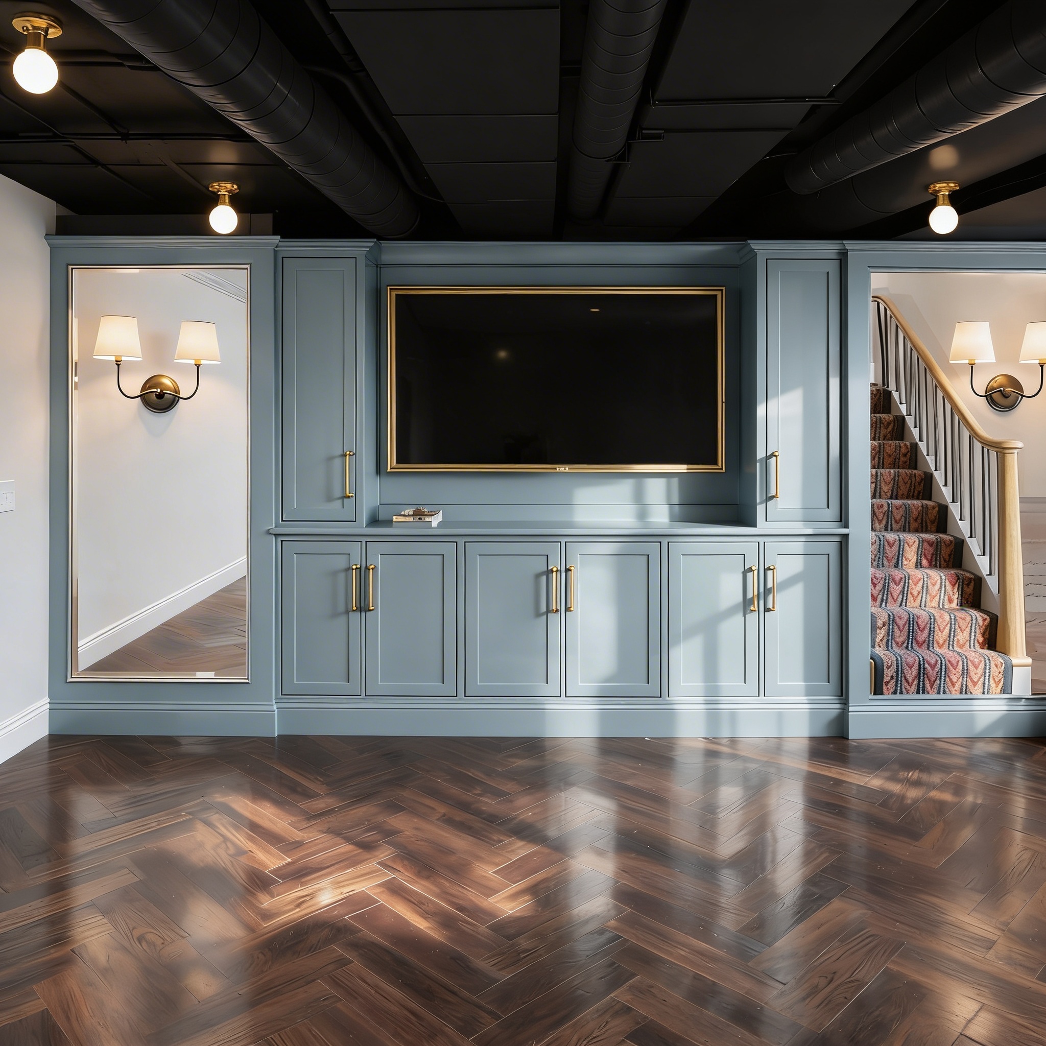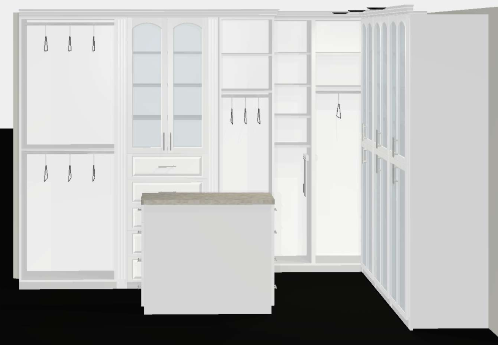 transform the input image into a photorealistic luxury master walk in closet designed in a neo classical french beaux arts style the space should feel grand symmetrical and highly ornate with strong classical architectural language incorporate fluted columns with corinthian capitals along with pilasters framing all cabinetry and openings add rich entablatures with dentil molding decorative friezes keystones aprons and layered crown moldings throughout emphasize depth shadow and hierarchy in all trim profiles design a ornate coffered ceiling with deeply articulated panels classical moldings and integrated detailing suspend a large traditional crystal chandelier at the center enhancing the grandeur add gold emblems all cabinetry should be finished with a luxurious polished appearance include integrated led lighting within all shelving drawers and hanging compartments to softly illuminate contents add gold emblems and hardware and insets fabric backers place a central island finished in wood walnut topped with calacatta marble with refined edge detailing style the space with subtle high end clothing and accessories neutrals tailored garments minimal clutter incorporate a decorative colorful mosaic tile with koi fish design for flooring inset in white black tile border lighting should be bright natural daytime with balanced ambient and accent lighting to fully illuminate architectural details and materials use soft shadows and warm highlights to enhance realism overall mood timeless ultra traditional and luxurious with a strong emphasis on classical ornamentation symmetry and craftsmanship avoid modern or minimalist elements render as a high resolution photorealistic interior visualization with true to life materials textures and proportions add subtle luxurious shoes and purses in these shelves also clothing and jewerly locate island centered in the space gold emblem and insets add new classical columns at ends with high ornamentation glass traditional glass fronts on doors make island dark walnut wood finish