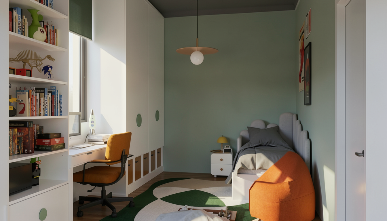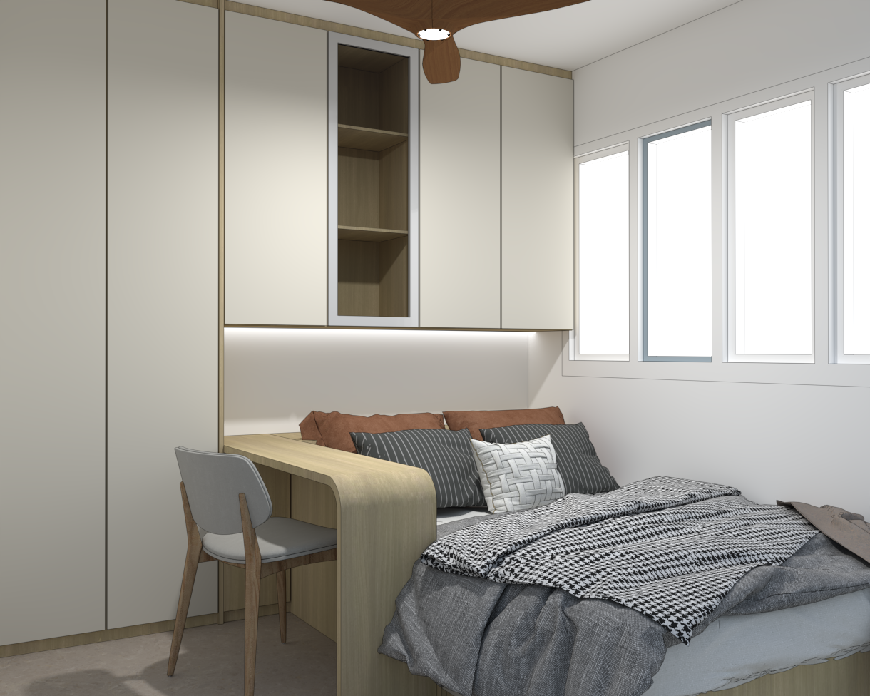 render a cozy modern bedroom with a soft neutral palette walls in a light cream color with minimalist cabinetry in an off white finish and subtle wood accents in light oak the bed is adorned with a mix of earthy brown and muted gray pillows featuring textured patterns a warm light wooden desk seamlessly integrates into the design with a matching chair cushion in soft gray the bedding includes a checkered pattern in dark gray and white complemented by a woven gray blanket natural light streams in through expansive clear windows casting gentle shadows and creating a serene and inviting atmosphere