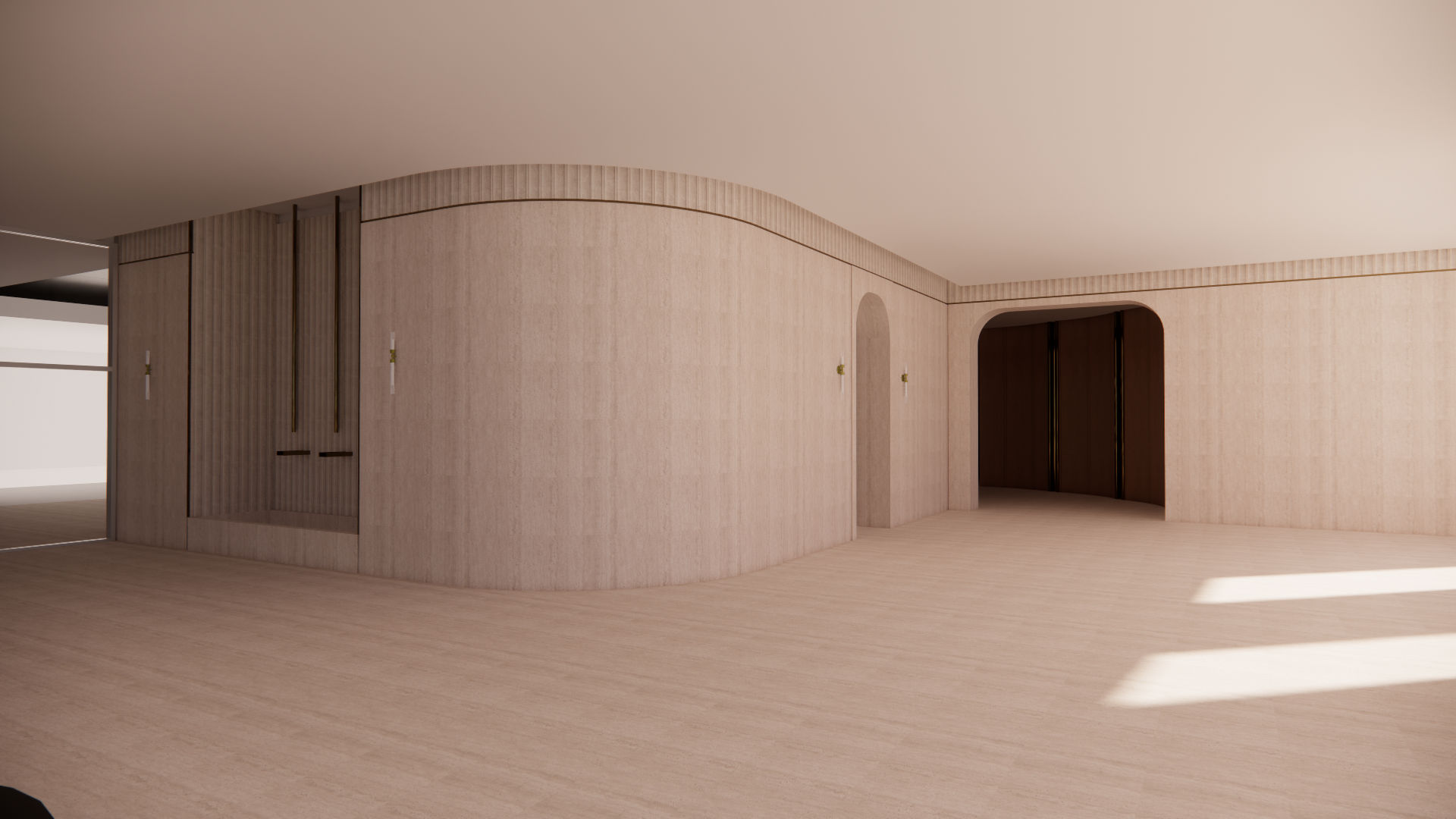 arno lobby realism prompt no ceiling modification enhance this image to appear as a highly photorealistic luxury residential lobby interior maintain the exact architecture layout ceiling height and all existing modeled elements do not add remove or modify any architectural features critical constraint ceiling cove lighting do not create or modify a cove ceiling do not add any new ceiling geometry recesses steps or dropped elements the ceiling must remain exactly as modeled the perimeter glow should read as indirect led lighting only integrated subtly at the ceiling edge the effect should appear as a soft ambient halo of light washing down from the ceiling perimeter not as a visible light source or constructed detail no visible led strips channels or architectural buildup keep the effect minimal refined and believable material realism keep consistent across images floors and walls are porcelanosa taranto bianco large format porcelain tile matte finish with soft light diffusion subtle slab to slab tonal variation clean minimal grout lines no gloss or heavy reflection upper wall detail is porcelanosa bianco deco toranto soft fluted curved texture light should gently graze the surface to reveal depth keep contrast subtle and elegant not busy lighting atmosphere use a mix of soft ambient daylight and warm interior lighting avoid overexposure preserve depth in white materials add gentle shadowing at floor to wall transitions wall to ceiling edges corners and recesses lighting should feel warm diffused and indirect calm and high end evenly balanced across the space realism enhancements add subtle imperfections slight tonal variation in tile soft shadow gradients natural light falloff maintain true scale and proportions keep all existing design elements exactly as is lens final style straight vertical lines no distortion eye level architectural photography crisp clean editorial look final result should feel like a real photograph of a high end condo lobby soft warm minimal and highly believable