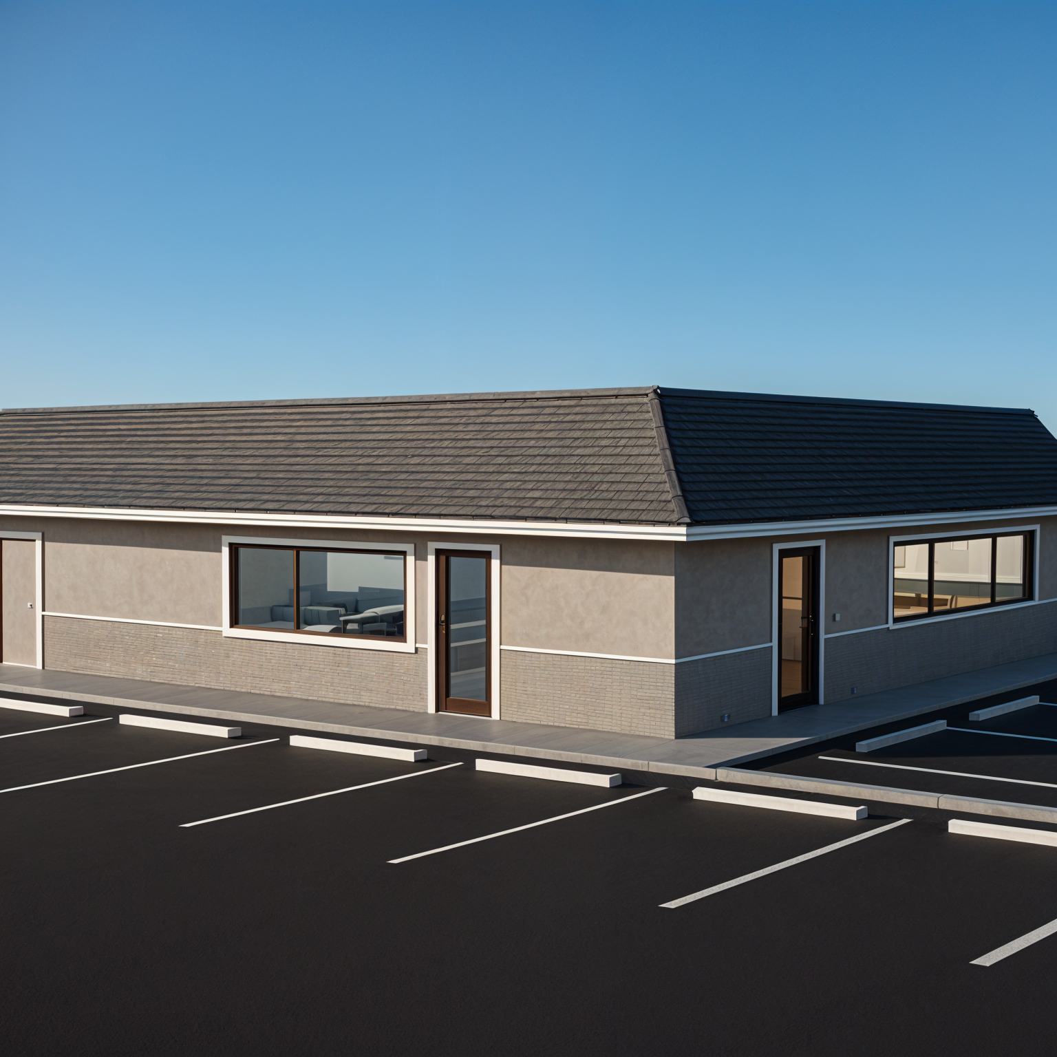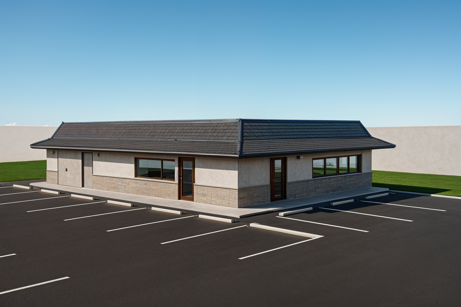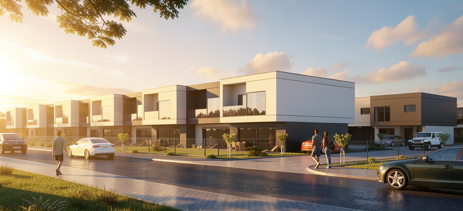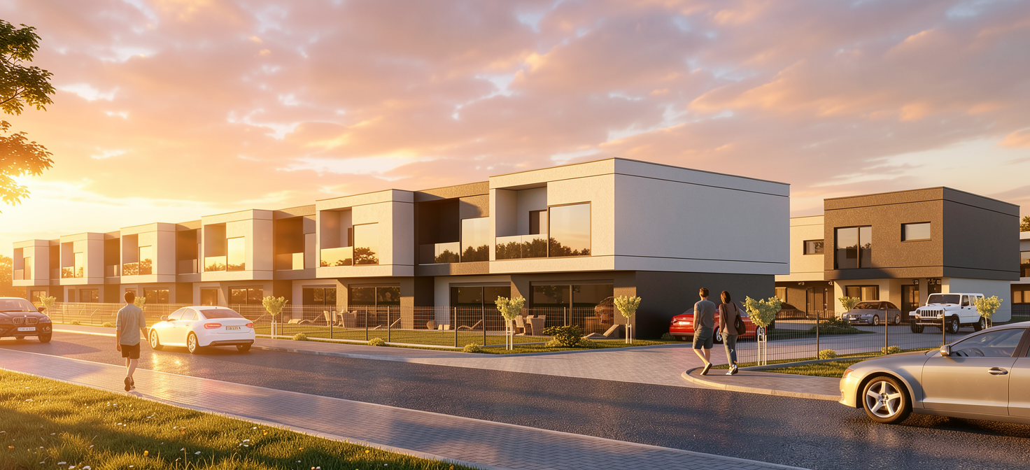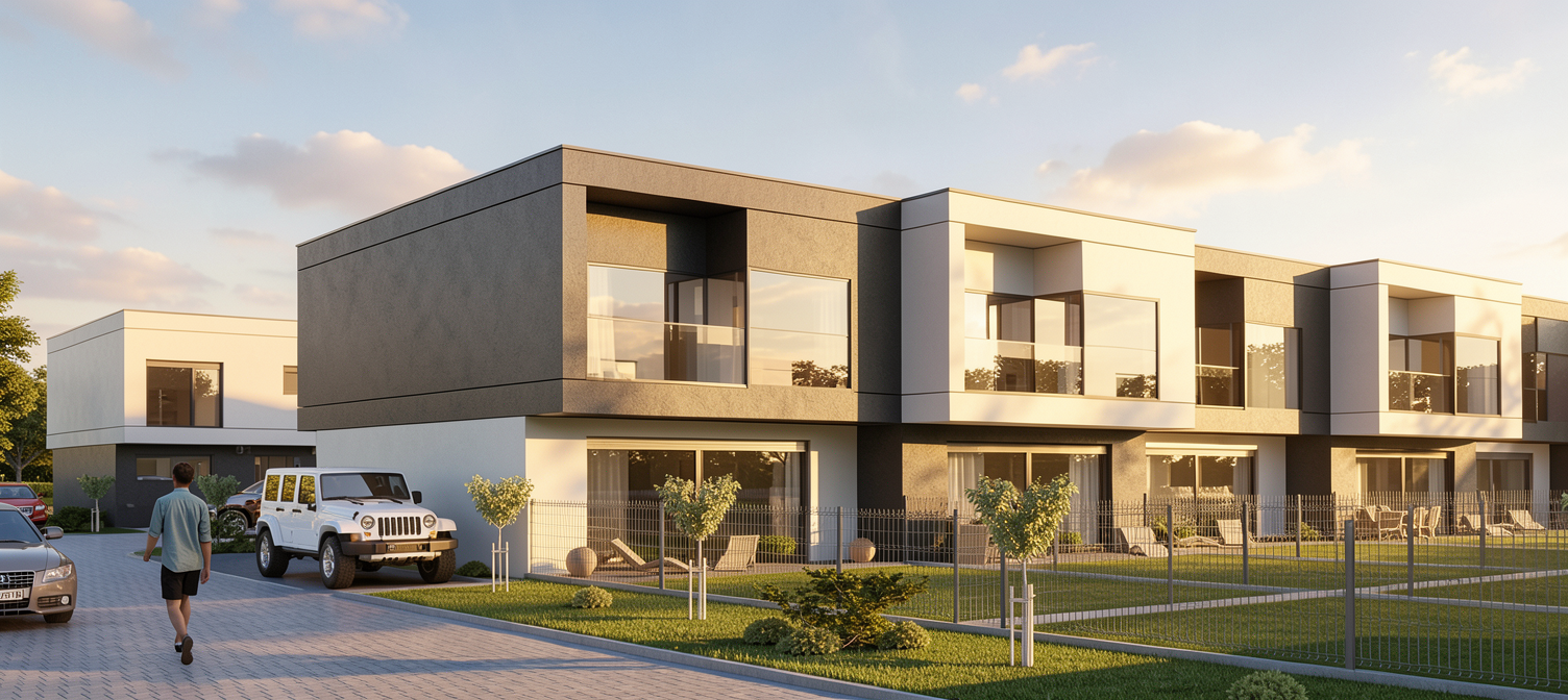 important preserve the existing geometry and the existing context exactly as provided do not modify alter reinterpret add remove scale or reshape any geometry do not change the site surroundings street layout neighboring buildings vegetation or context elements do not modify geometry scale proportions buildings road layout sidewalks or surrounding context in any way do not change text photorealistic architectural rendering clean and balanced contrast calm cinematic mood style contemporary european residential architecture minimalist premium understated do not alter the church color soft overcast noon atmosphere diffused natural daylight with subtle blue grey tones cinematic architectural mood large glass surfaces with realistic reflections soft mirror effect subtle environmental reflections of sky and surroundings wet pavement with smooth reflective surface soft light bounce and blurred reflections high dynamic range lighting realistic global illumination soft shadows calm and minimalist nordic mood photorealistic architectural visualization balanced exposure no harsh highlights add interior warm light do not modify text add motion blur to the carsdo not add people in the foregrounddo not alter the white lines from the pavementdo not alter the crosswalkdo not alter the reddo not alter the motion lines do not alter the facade material