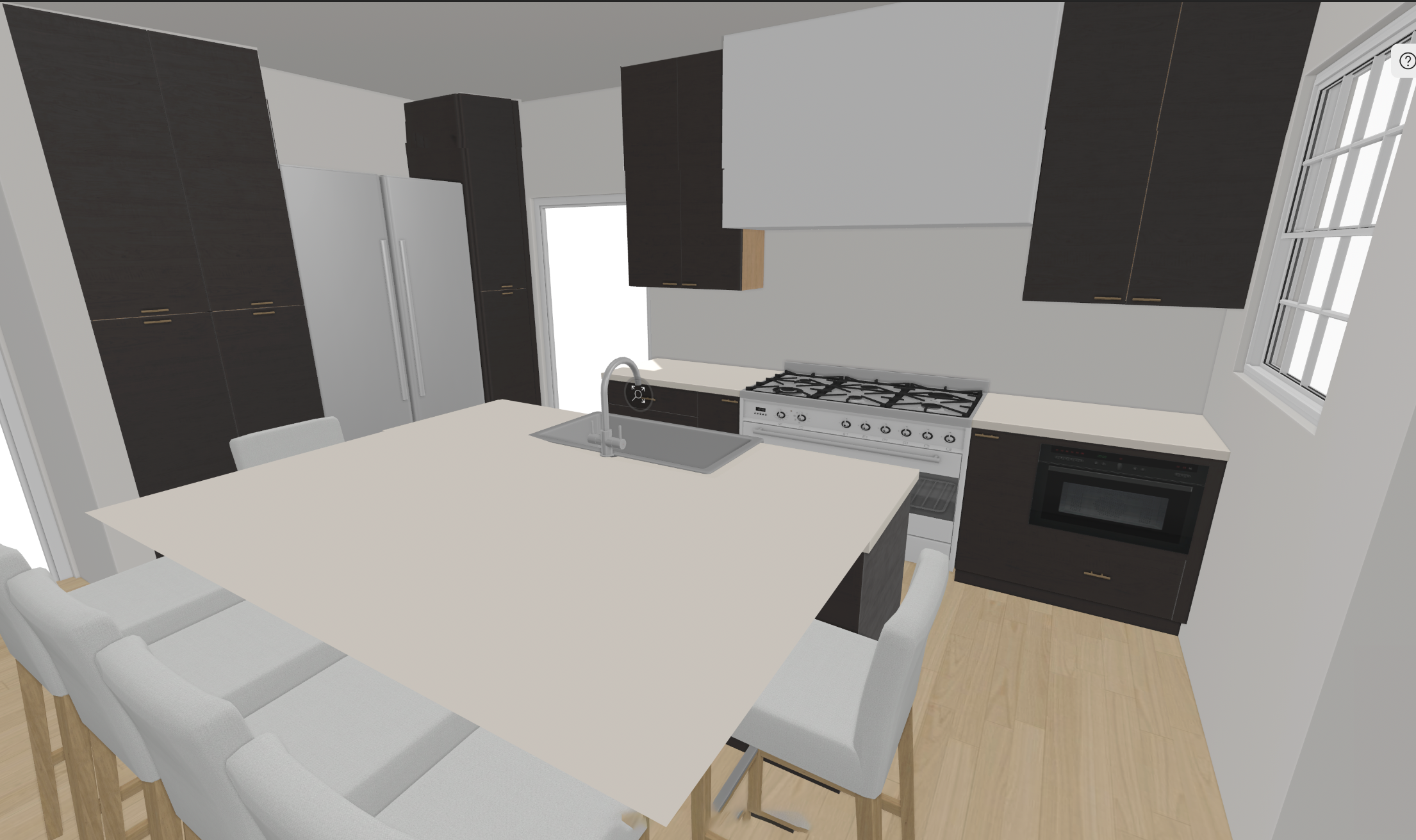 quartzite countertops and backsplash tambour vent hood stainless steel appliances gray wood floors