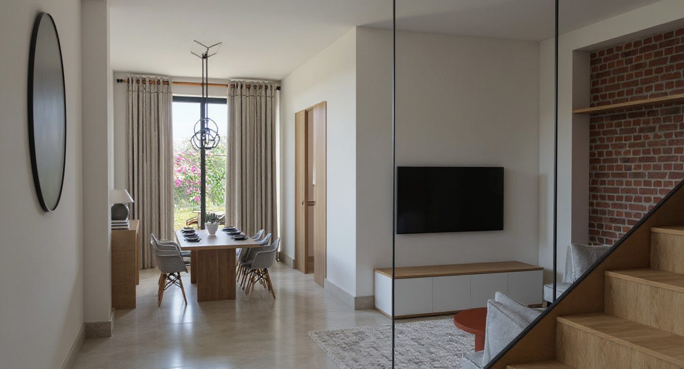 strict edit only prompt archsynth use the uploaded image as the sole and exact reference preserve all geometry composition camera angle furniture materials textures proportions objects layout and details exactly as they are do not add remove replace reinterpret or redesign anything the only allowed changes are the following no others stair glass profile change the metal profile of the stair glass both the vertical profile and the lower horizontal profile where the glass meets the wooden stair from its current almost black finish to a dark copper metallic finish the profiles must remain exactly in the same position with the same thickness alignment and geometry the copper finish must be subtle refined and realistic brushed or satin metal do not alter the relationship between the glass and the wood wall color change all interior walls to a warm beige tone the color must be soft neutral and warm not grey not yellow not pink wall texture must remain smooth and minimal baseboards z calos set all baseboards to the same warm beige tone as the walls do not use pure white keep the existing height profile and placement unchanged lighting adjust the overall ambient lighting to a warm tone maintaining realistic soft illumination no dramatic lighting no contrast exaggeration no cinematic effects dining table pendant lamp turn on the pendant lamp above the dining table the light must be warm soft and realistic do not change the lamp design position scale or intensity beyond a natural warm glow absolute restrictions do not change furniture stairs floors rugs curtains brick wall doors shelves tv cabinetry or decor do not add or remove objects do not modify materials other than those explicitly listed do not change layout scale or proportions no sketch look no painterly effect no stylization no ai hallucinated elements the final image must be identical to the original render with the only visible differences being the dark copper metallic stair glass profiles vertical and lower horizontal the warm beige walls the beige baseboards matching the walls the warm ambient lighting and the pendant lamp above the dining table turned on any change beyond these five points is not permitted