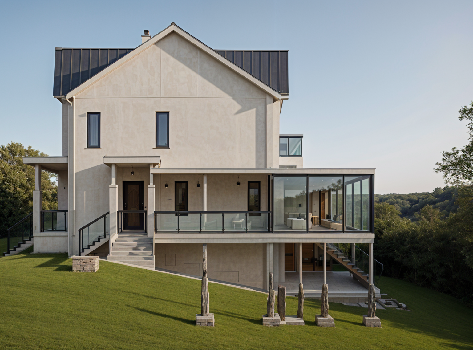 four stepped mdoern townhouses on a sloping site the driveway is a boulevaed with a green belt either side the houses are modern forms with considered openings for glazing white stucco plaster brick and chacroal joinery