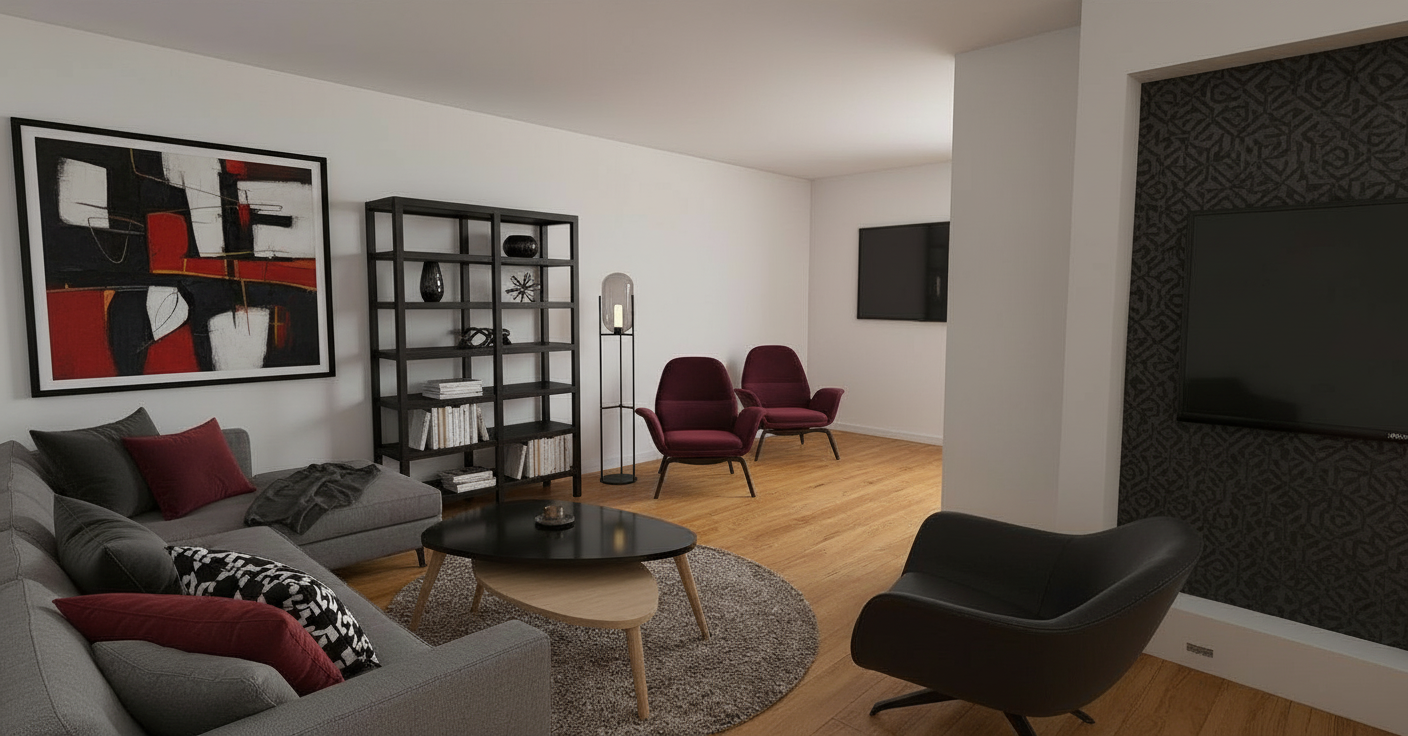 layout the same modern furniture color palette white and grey and black with adding some collor for highlight wall with tv with wallpaper architecture