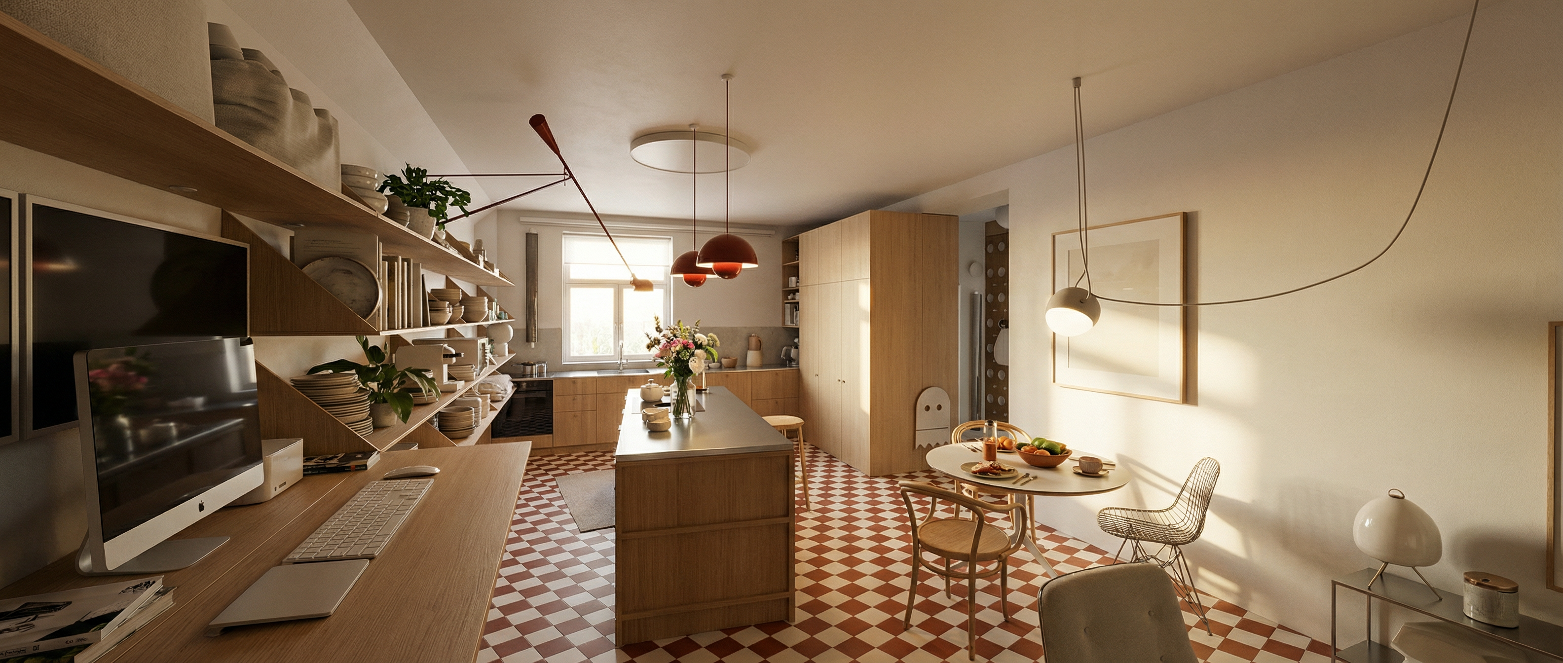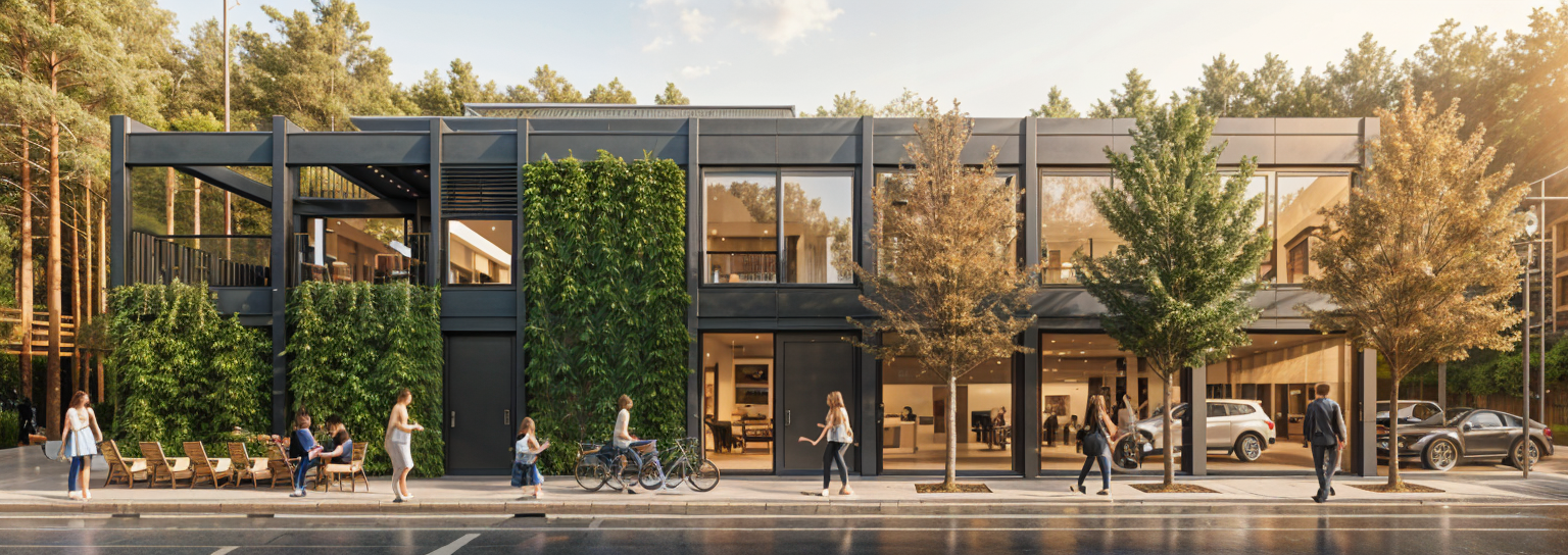 place wood flooring and gres cream flooring insert in the middle the central volume is covered with stainless steel perforated panels cladding alongside the facade please put wood and velvet restaurant bench with dining tables for and chairs
