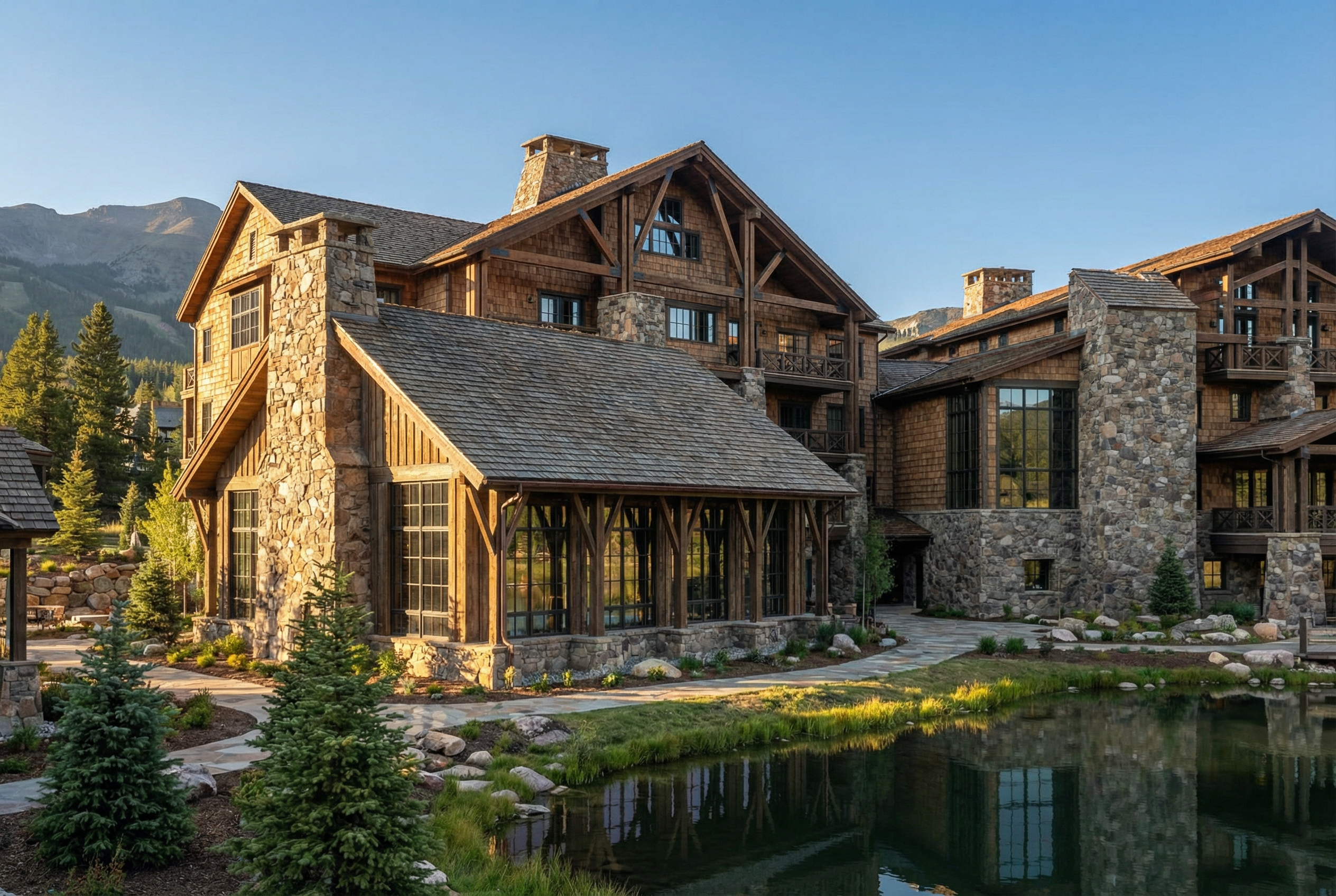 mountain resort architecture with stone and wood 2d view