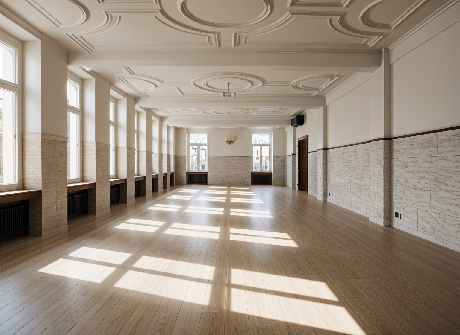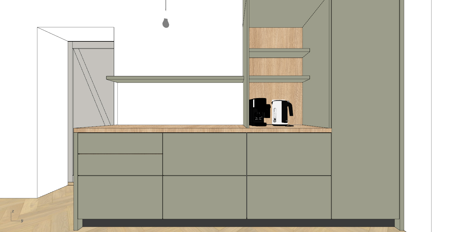 render a modern kitchen interior with a minimalist design use soft olive green for the cabinets on the left side and a light wood finish for countertops the upper cabinets should be in a warm natural oak hue design a stylish white marble backsplash with subtle gray veining incorporate sleek black fixtures for the faucet and handles the flooring should be a light herringbone wood pattern add large patio doors with dark green frames showing a soft serene garden view outside the atmosphere is warm and inviting with natural light flooding in creating a cozy yet elegant ambiance
