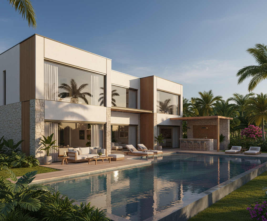 exterior shot photorealistic front fa ade render of a modern tropical farmhouse inspired by the reference image the architecture features clean horizontal lines flat roofs with warm wooden soffits textured plastered walls and natural stone accents large floor to ceiling glass doors and windows create a seamless indoor outdoor connection the entrance is defined by a minimal pathway soft landscape lighting and tropical greenery with palm trees and dense foliage include warm natural tones beige stone teak wood and soft white stucco the overall atmosphere should feel calm luxurious and inviting blending contemporary design with nature lighting should be soft golden hour sunlight with realistic shadows and reflections on glass and stone style modern tropical luxury photorealistic detailing cinematic composition ar 16 9 v 6 style photorealistic quality 2