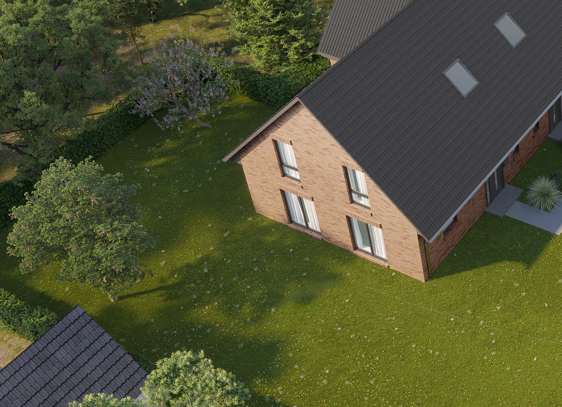 improve image quality for maximum realism replace the large tree on the left with an extended landscape design add a patio area in front of the doors featuring a grill plants and garden furniture maintain the grass area while adding decorative flower beds ensure all added elements are correctly scaled and proportional to the house size
