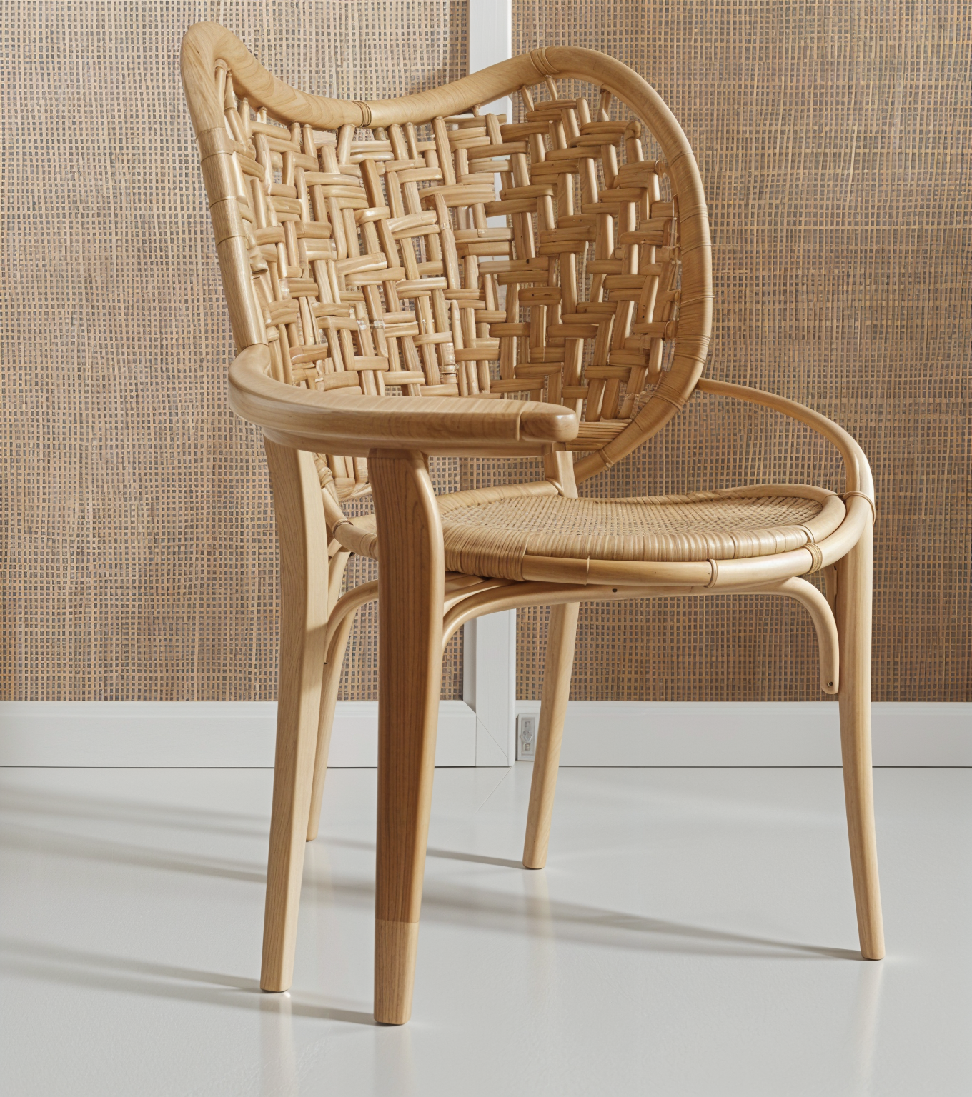 modernist rattan weaving inspired chair wooden wire brush finish legs upholstered seat and back architecture