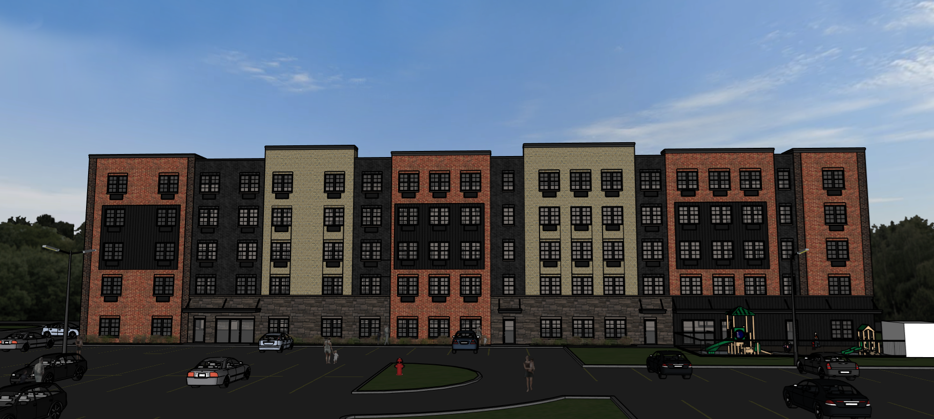 render a photorealistic 3d perspective of this apartment building in bracebridge ontario reference the current material styles and colours just enhance the brick and stone veneer black steel siding black red and brown brick concrete sidewalks keep model geometry the same for windows doors and walls in town setting enhance the current materials detailed textures in the siding and glass reflections vibrant clear sky with light atmospheric depth render in hyper realistic architectural visualization quality 8k resolution enhance playground with kids playing new asphalt parking lot with parking islands with just grass and vegetation is low and well kept