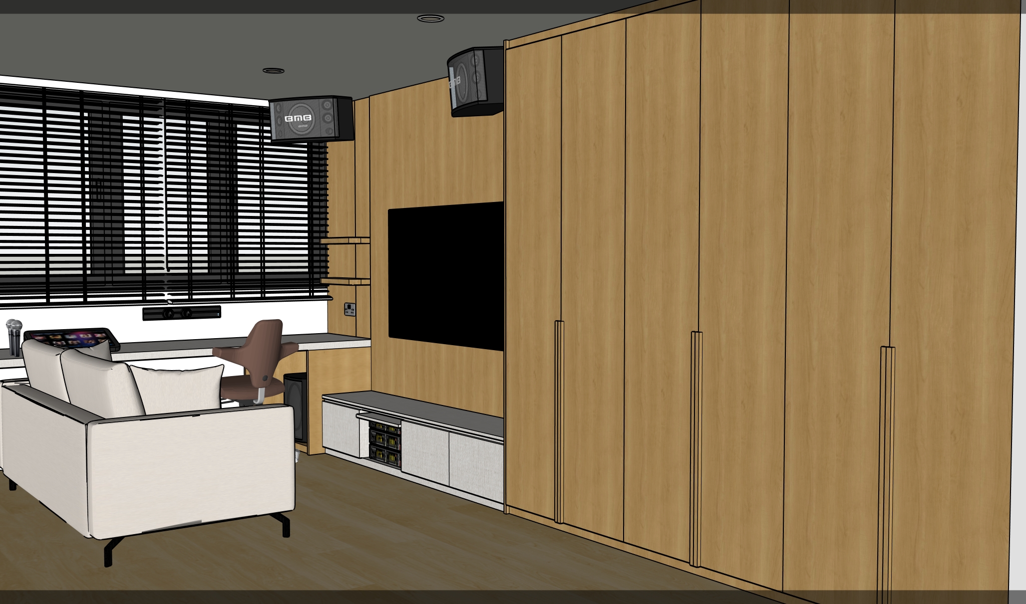 colours and wood texture less grains to remain accurate as per given picture blinds in off white tv console in like fabric off white full height cabinet door handle protrude out by 20mm