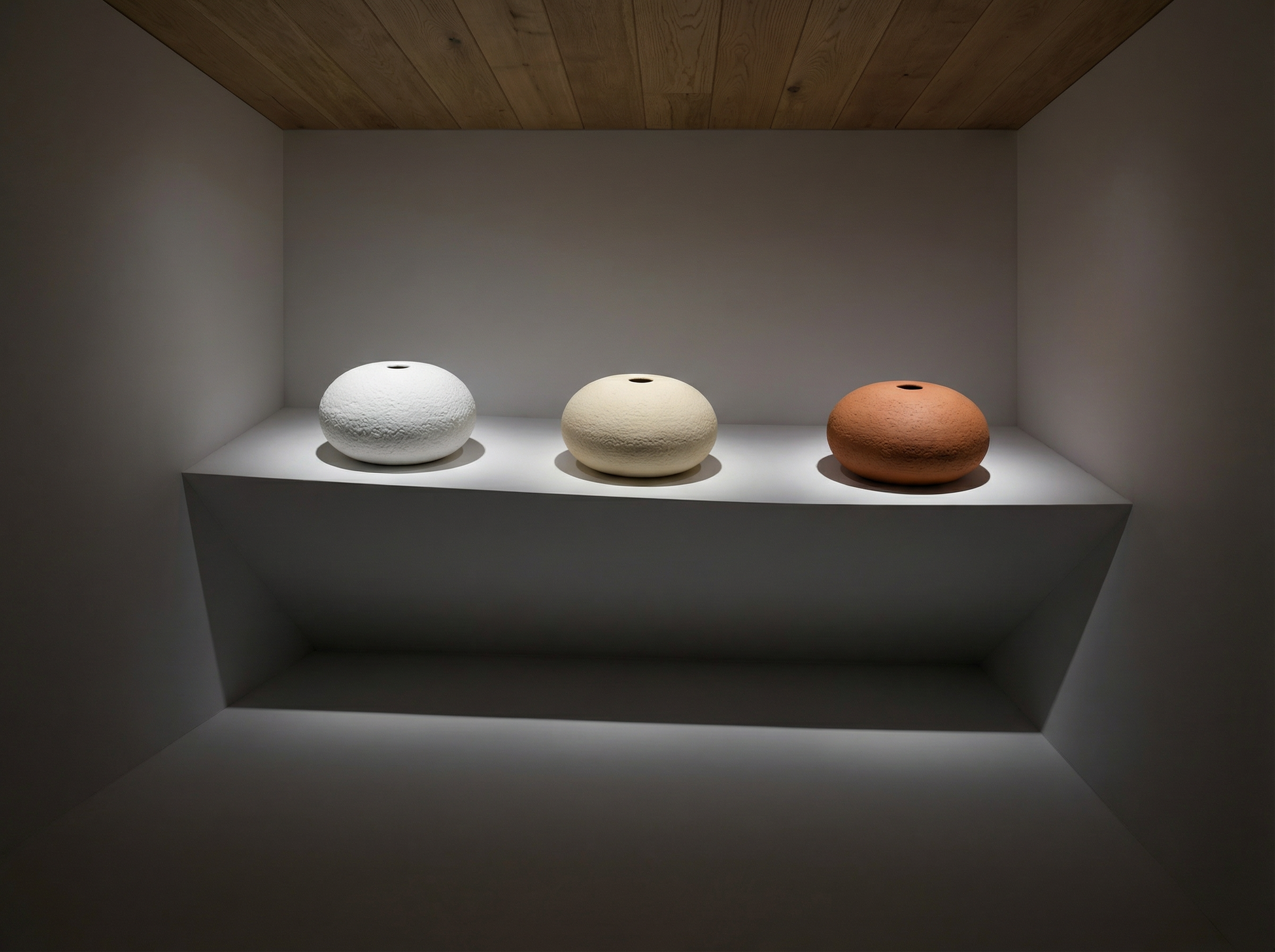 conjunto de tres esferas cer micas con textura rugosa y un peque o agujero circular en la parte superior son de colores blanco crema y terracota est n situadas sobre una peana con un plano inclinado de color blanco las paredes y el techo son blancos y el suelo es de tarima de roble con las tablas paralelas a la pared donde se sit an las esferas la luz es puntual sobre cada una de las esferas y el resto de la estancia est en una cierta penumbra