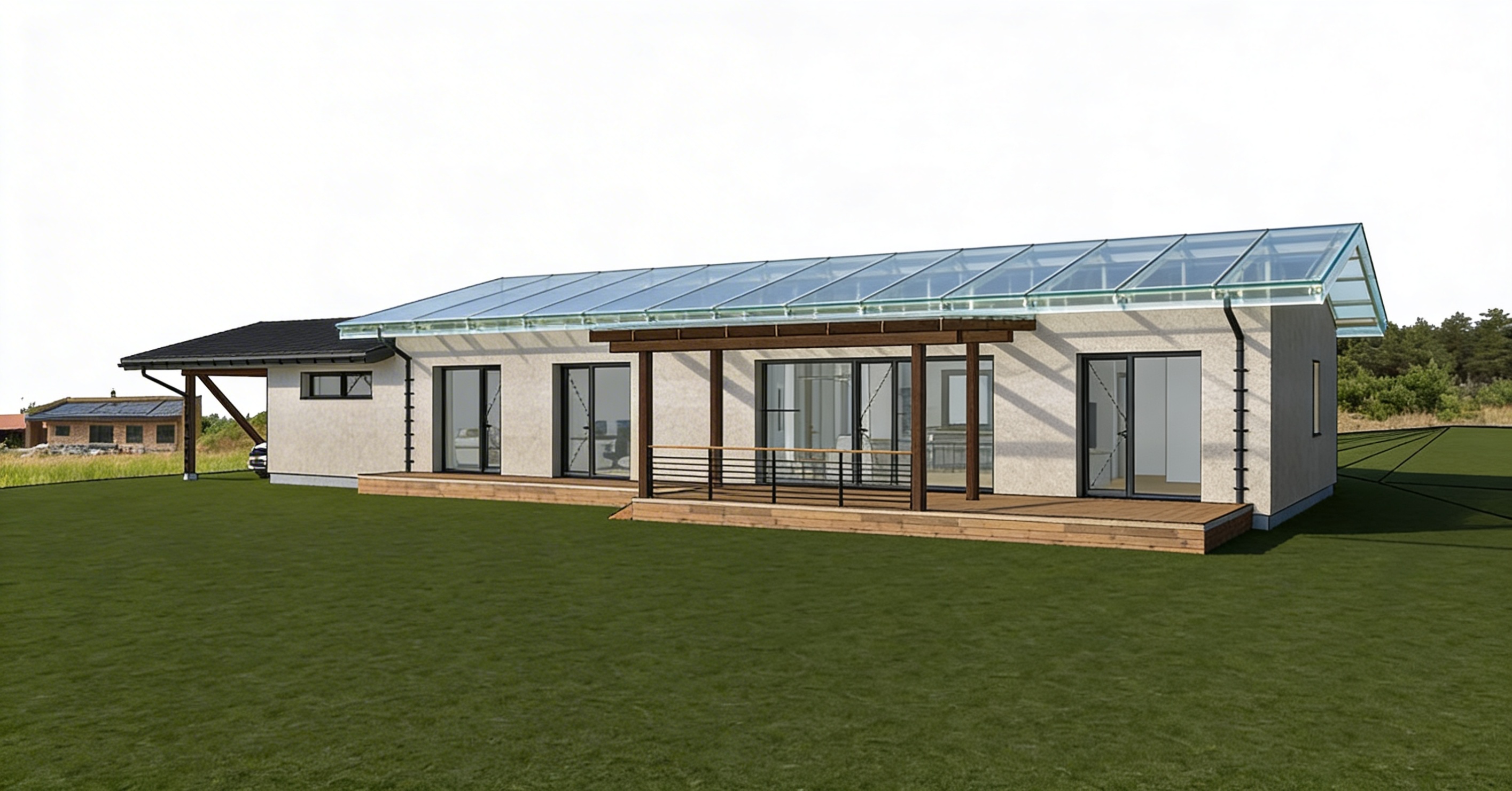 add landscaping with new zealand vegetation to front of deck and gravel driveway behind house hills in the background