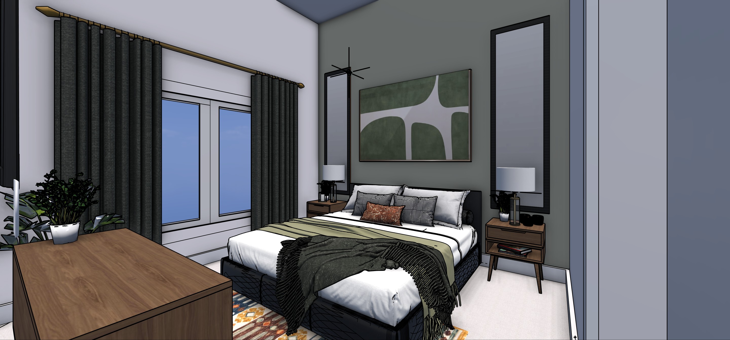 modernist interior shot create a serene and midcentury modern bedroom interior a cozy bed with white and dark green bedding soft white walls and a green abstract painting above the bed add stylish dark olive curtains on golden rods flank the bed with wooden nightstands each featuring a modern green glass lamp use a medium walnut wooden dresser and a colorful rug with warm tones on the floor include a small lush green plant in a white pot the atmosphere is tranquil and inviting with soft ambient lighting filtering through the large window add rich oranges or rust colors to accent the olive green tones the cieling light is a midcentury modern chandelier architecture