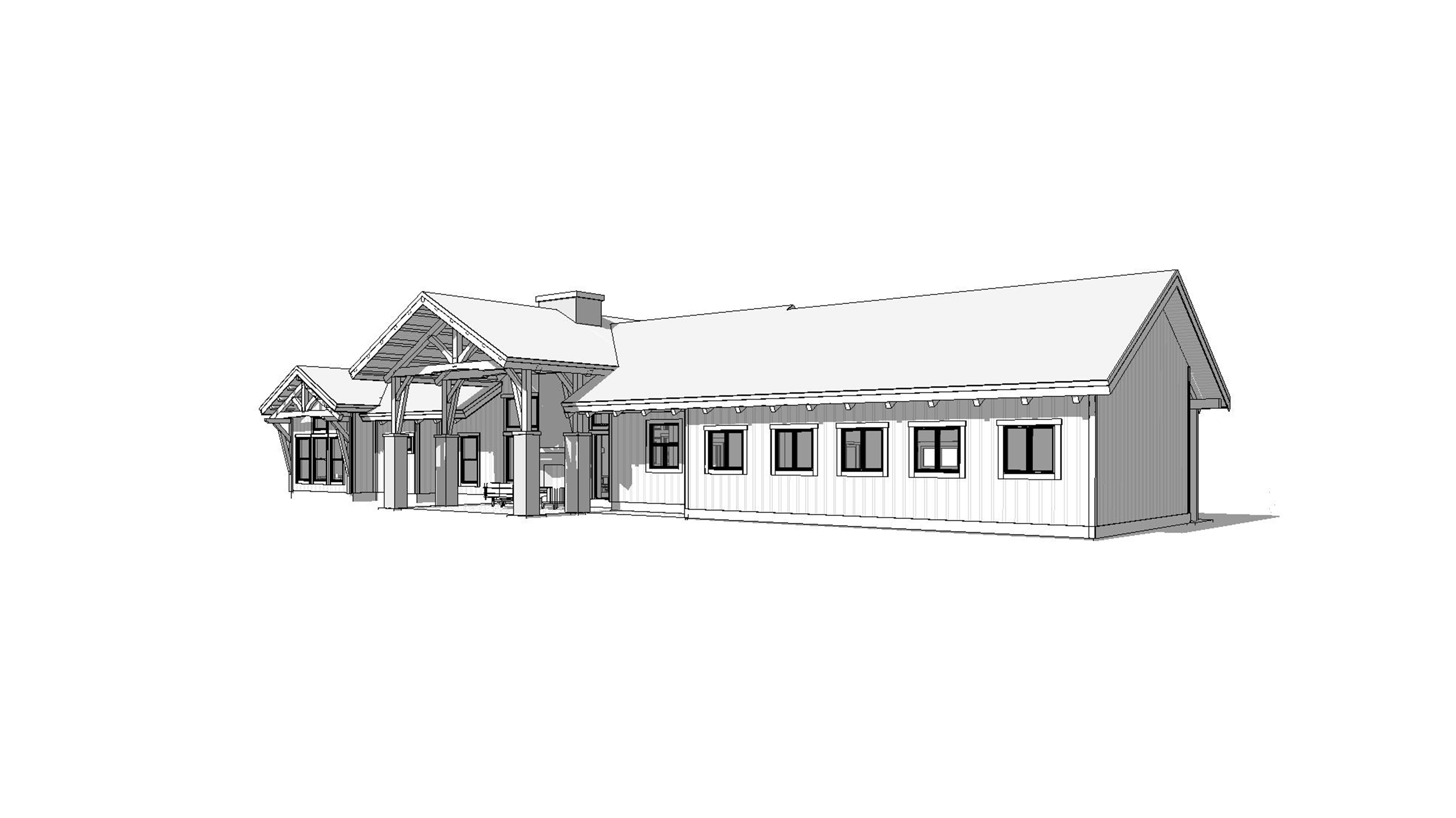 clean mountain modern timber architectural exterior rendered in cinematic vibrant mid morning lighting with blue skies and fluffy white clouds mountain modern with heavy timber architectural style select grade horizontal cedar wood siding beautifully lush green manicured landscape around structure with hedges and gardens black standing seam metal roof prominent cinematic northern california forest with big beautiful redwoods surrounding the house in the background high fidelity photorealistic visualization crisp shadow falloff refined facade geometry soft atmospheric depth premium architectural photography mood ultra clean composition and materials dark trim around windows