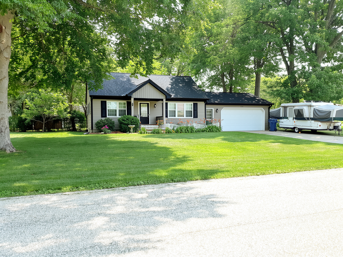 change the color of this house to greige with black shutters change the roof color to black add a large front porch with gable roof add a white garage door fascia and soffit to be black