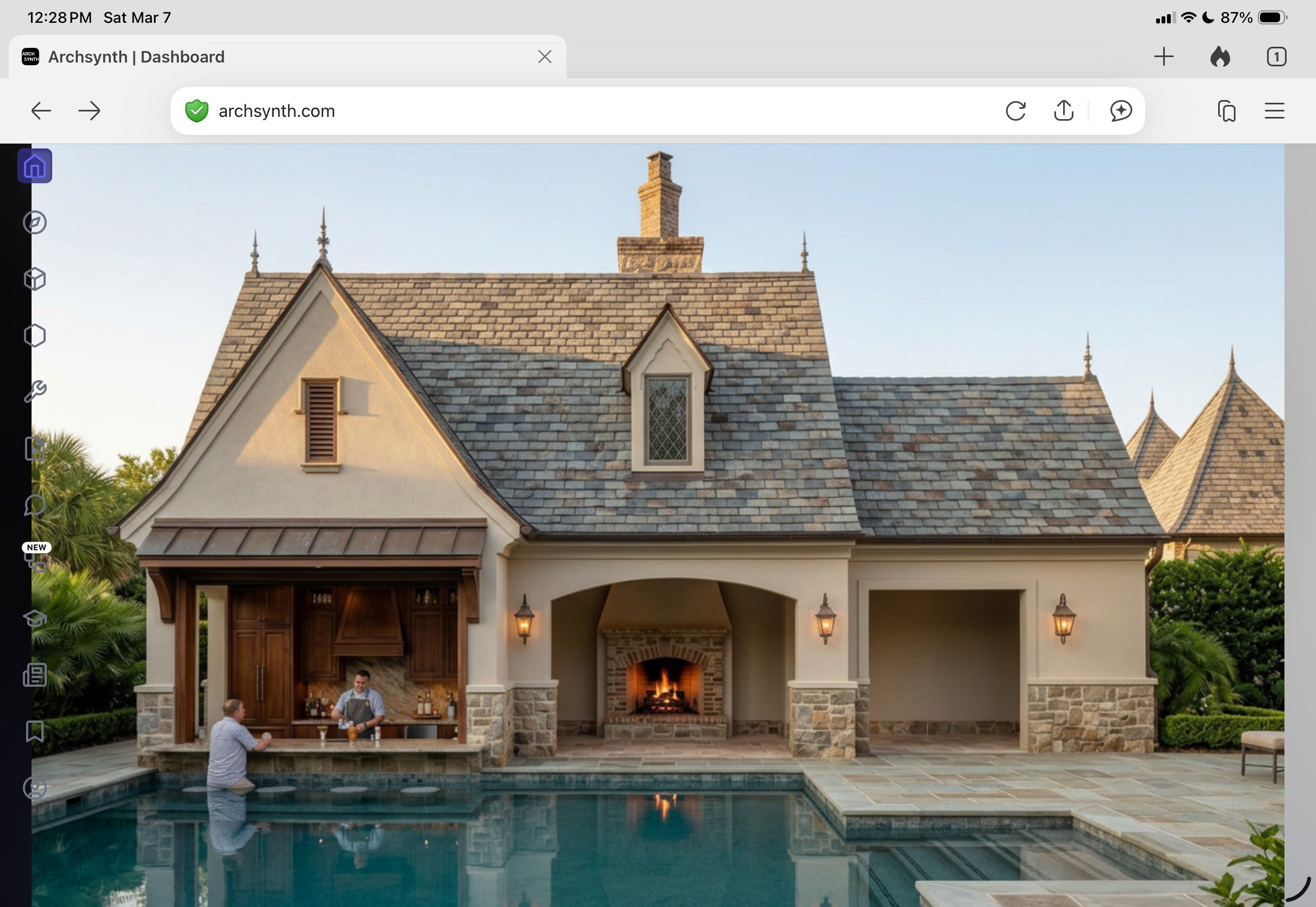 the pool should be a long pool perpendicular to the structure only as wide as the gabled swim up bar section of the structure keep all details of structure modify pool only