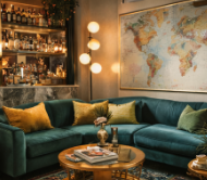 turn this image into a luxury room with fresh flowers on the table high end liquor on the bar and luxury textiles